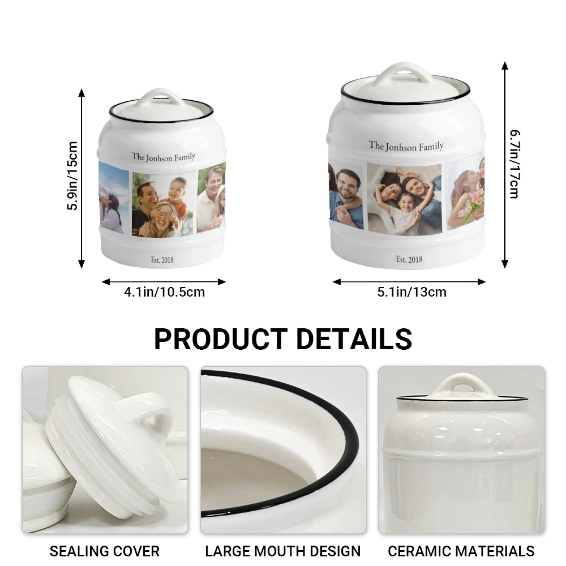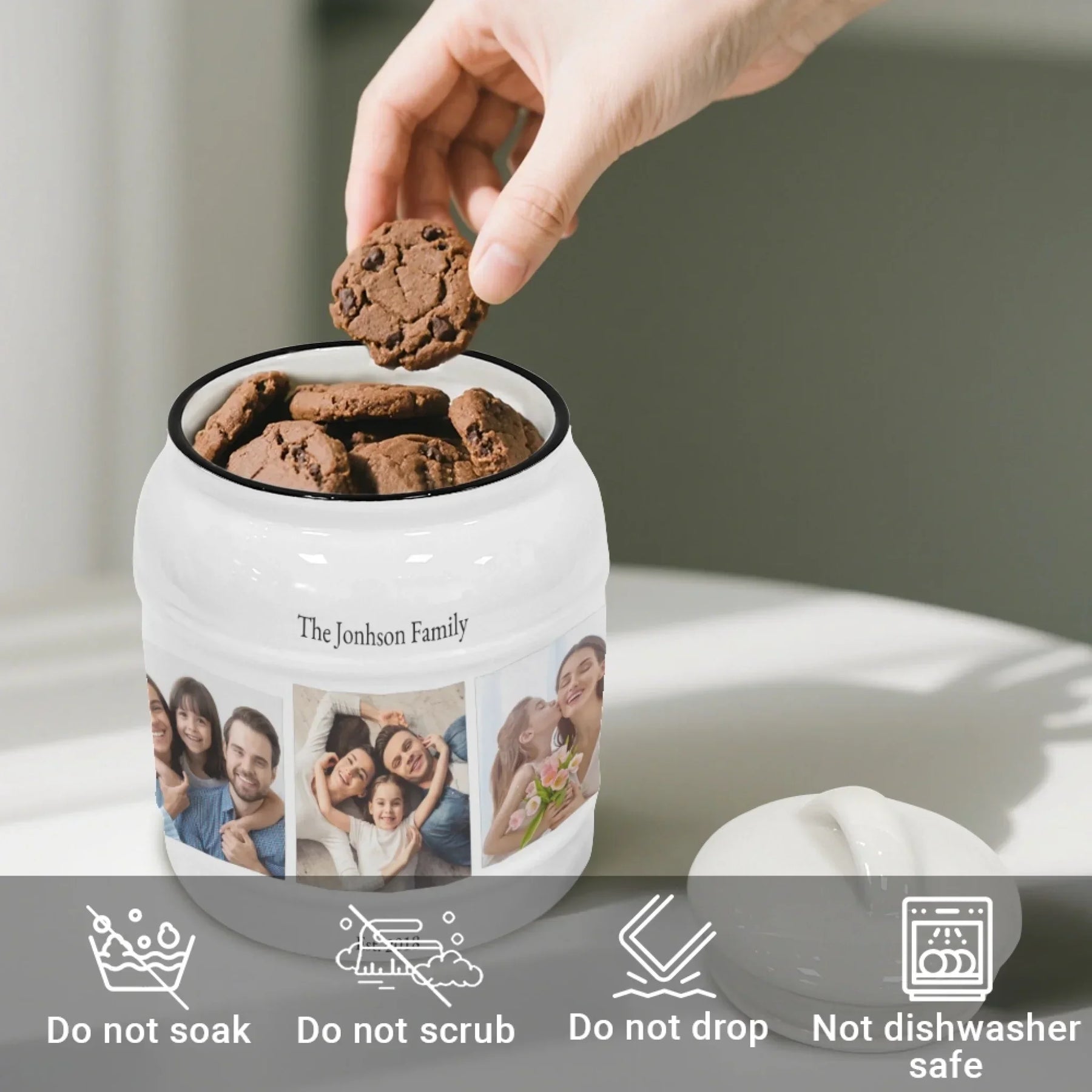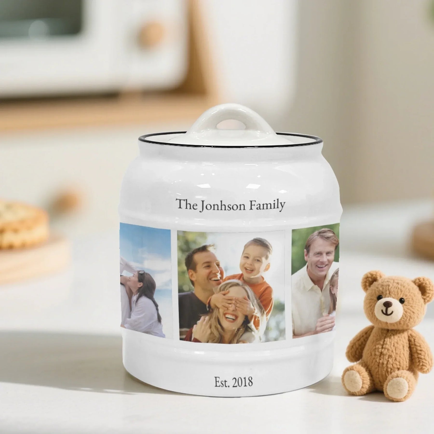 This ceramic cookie jar brings beauty, functionality, and emotion together. It adds charm to any room while preserving your favorite photos in a creative, practical display. Keep your treats fresh and your memories close with this stunning custom collage jar.
