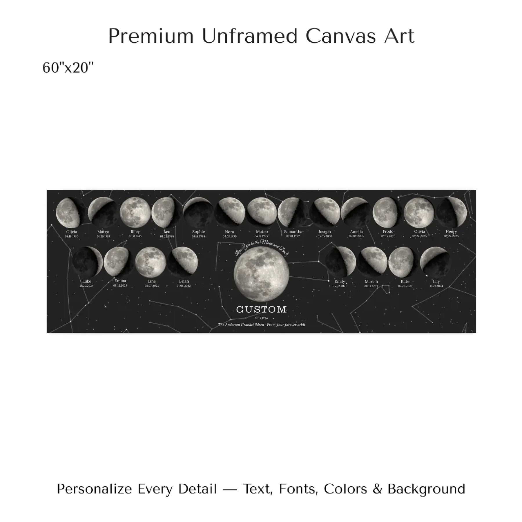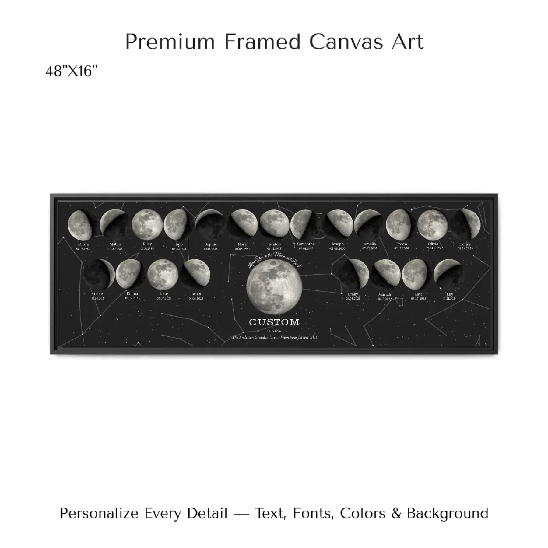 Each moon includes a personalized name and date of birth printed clearly beneath. Above the central moon, you can add a custom arched message like "Our Family’s Light" or "Guided by Her Love". A personalized footer message allows you to include an inspiring quote, dedication, or family motto at the bottom of the artwork.