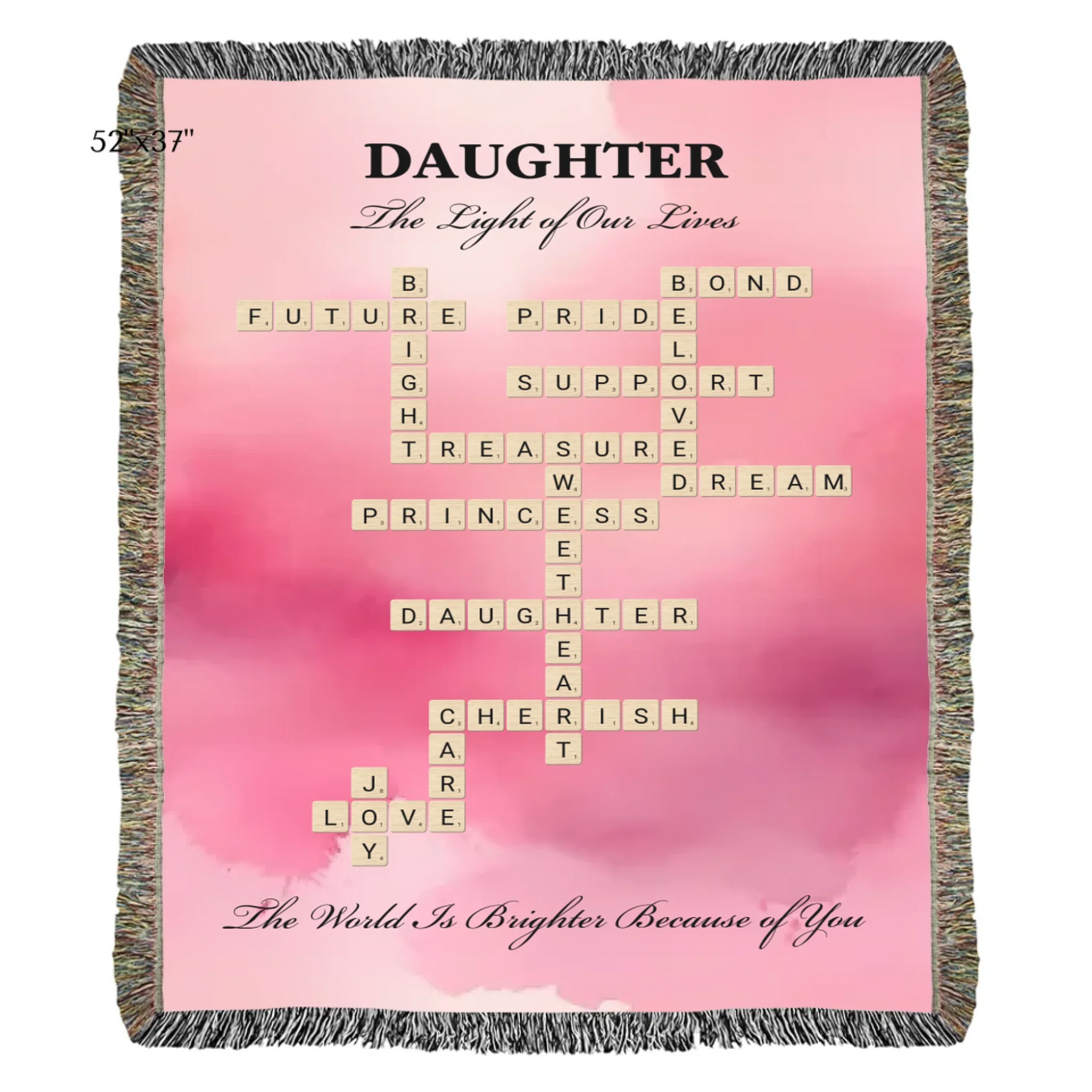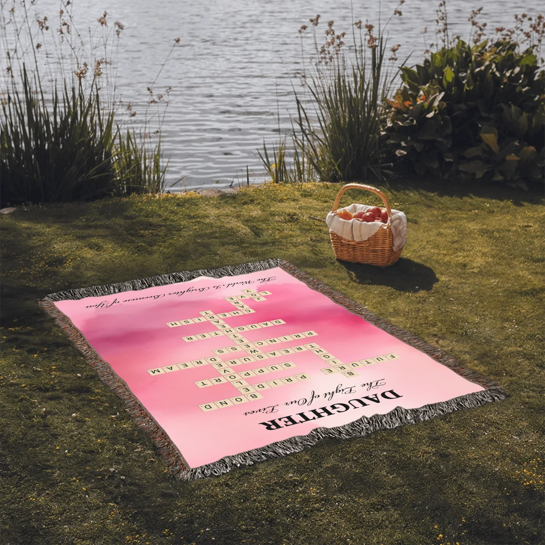 Celebra el vínculo especial con tu hija con esta manta personalizada con palabras para hijas. Ofrece dos opciones de diseño: palabras seleccionadas para hijas, con un conjunto de palabras cuidadosamente seleccionado, o crea tu propio diseño de palabras, donde puedes personalizar cada palabra para crear un diseño único y significativo. Personalízala aún más añadiendo hasta 100 palabras o nombres en un diseño de letras, además de opciones de color, color de fuente, color de fondo, título, subtítulo y texto de pie de página. Esta manta, bellamente confeccionada, es perfecta para cumpleaños, el Día de la Hija o simplemente como un recordatorio de tu amor y orgullo.