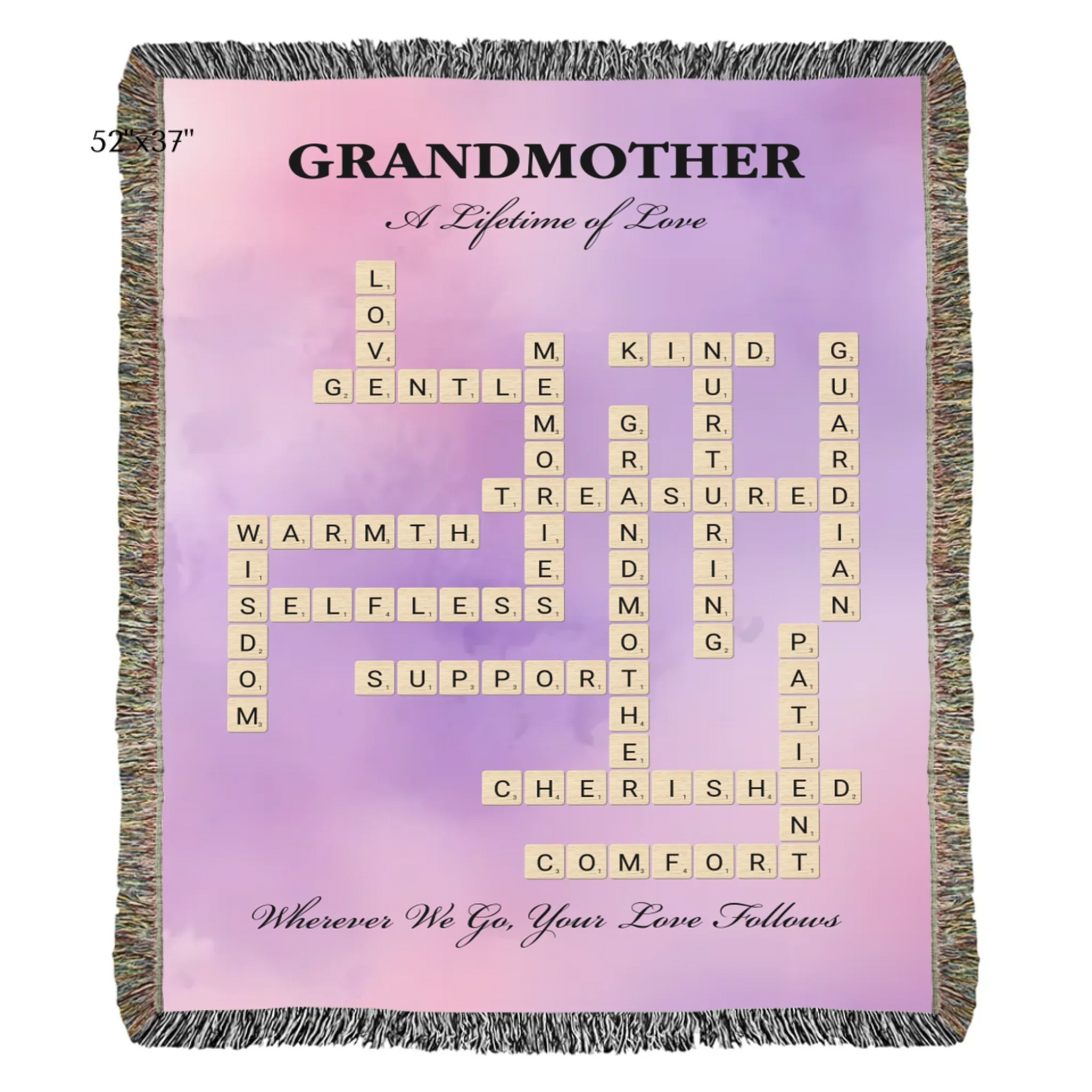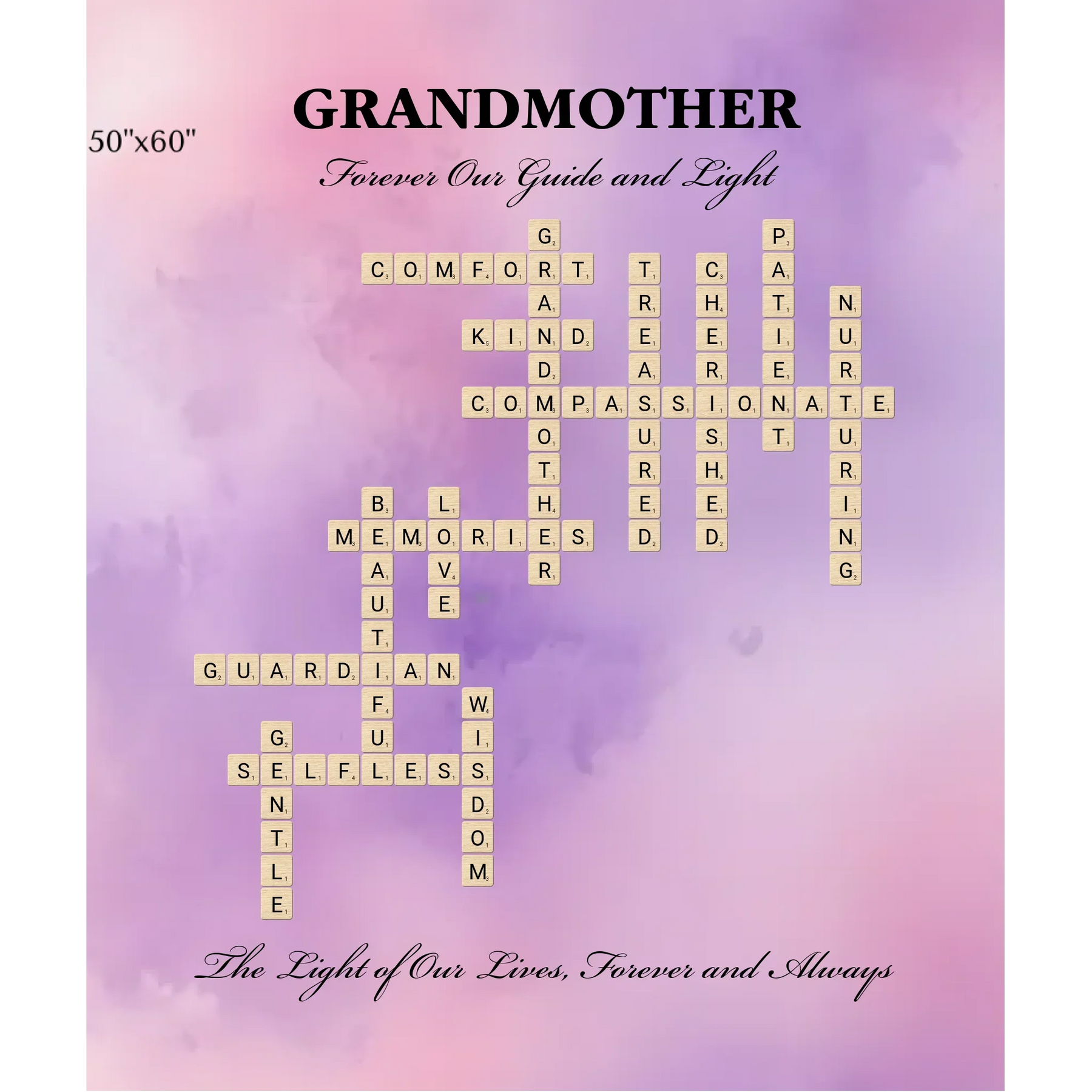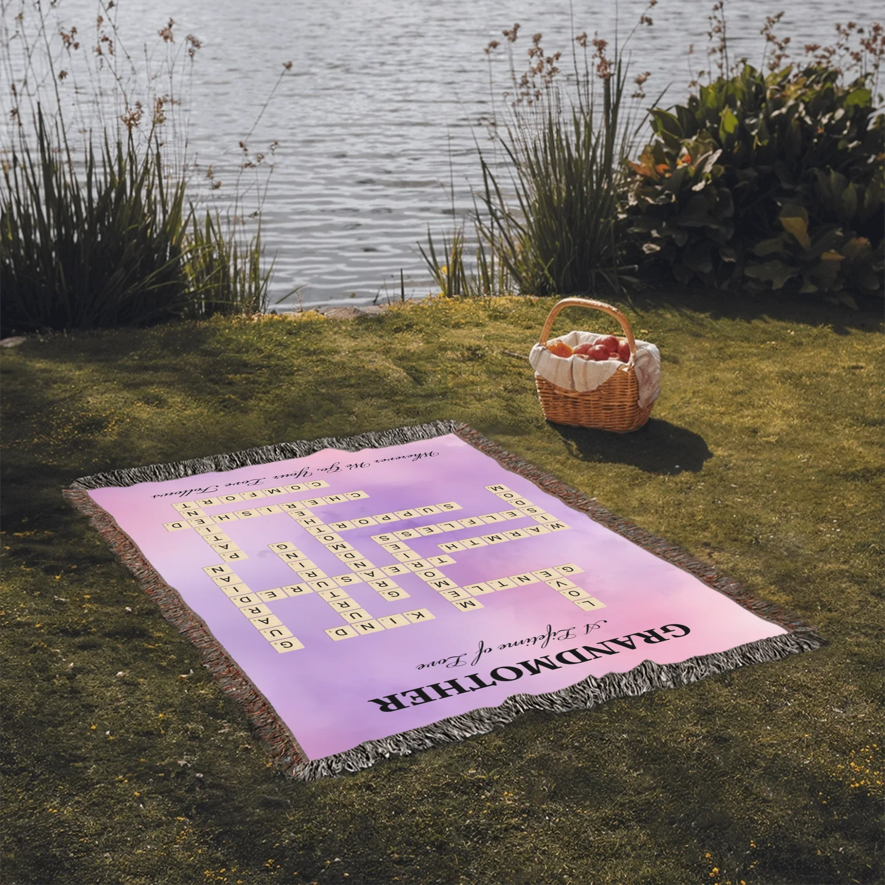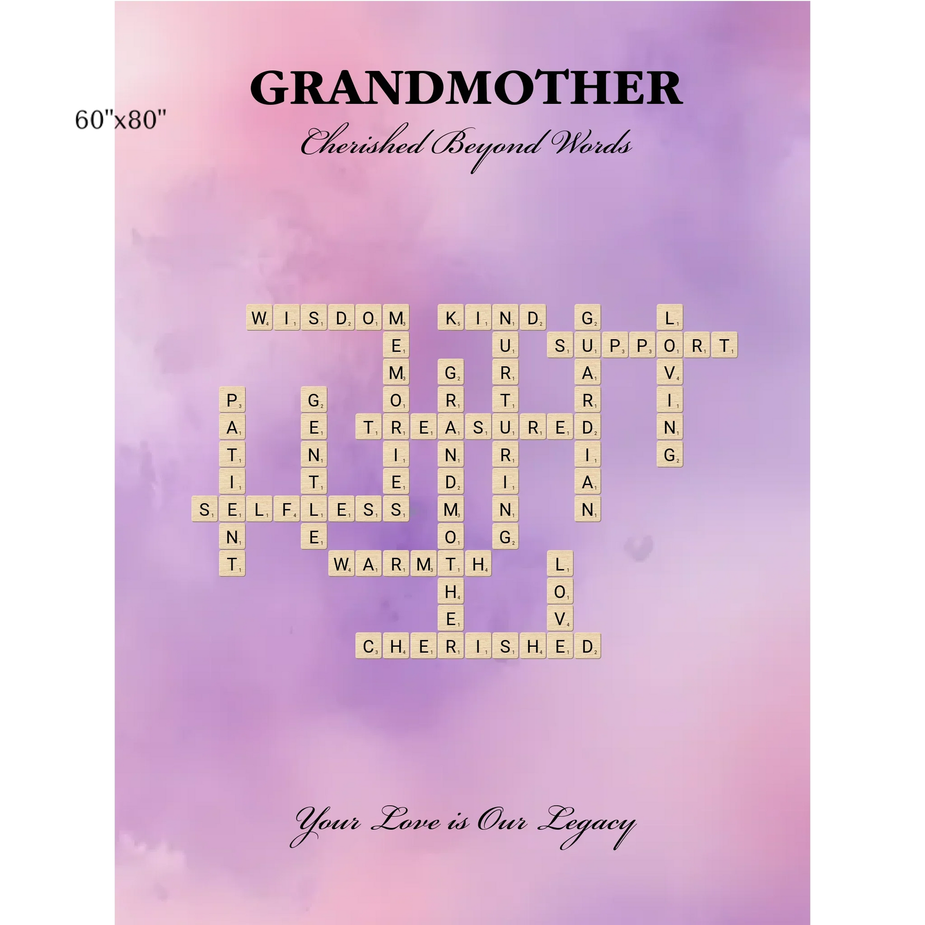 Honor the love and warmth of a mother with this Custom Grandmother Word Tile Blanket. Featuring two design options, Curated Words for Grandmother, a pre-designed word puzzle with carefully chosen words that celebrate grandma, or Build Your Own Word Art, allowing you to fully personalize each word. This beautifully crafted grandmother blanket can be customized with up to 100 names or words in a letter tile layout, tile color, font color, background color, as well as a title, subtitle, and footer text for a truly unique keepsake. Perfect for Mother’s Day, birthdays, or just as a heartfelt reminder of your love and gratitude.