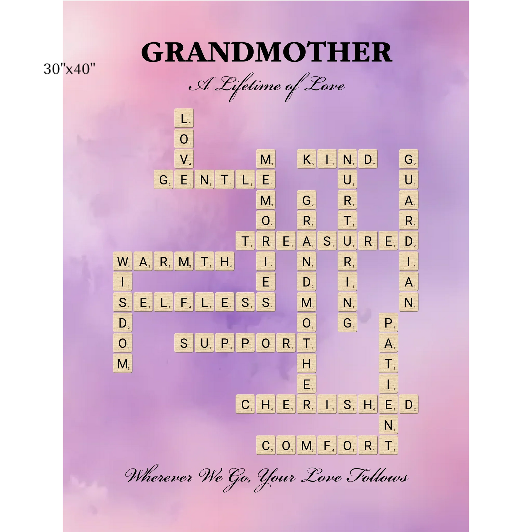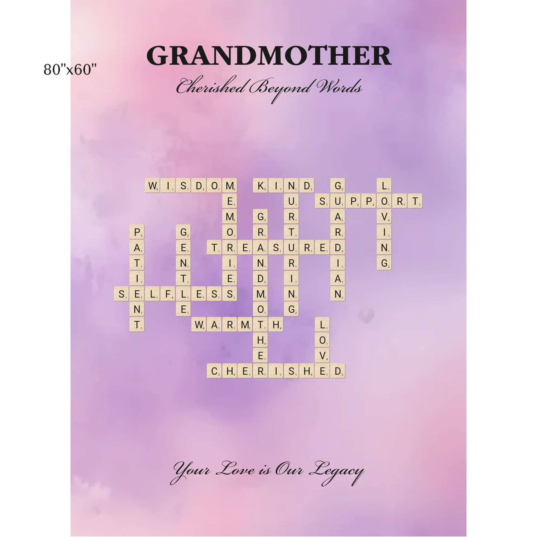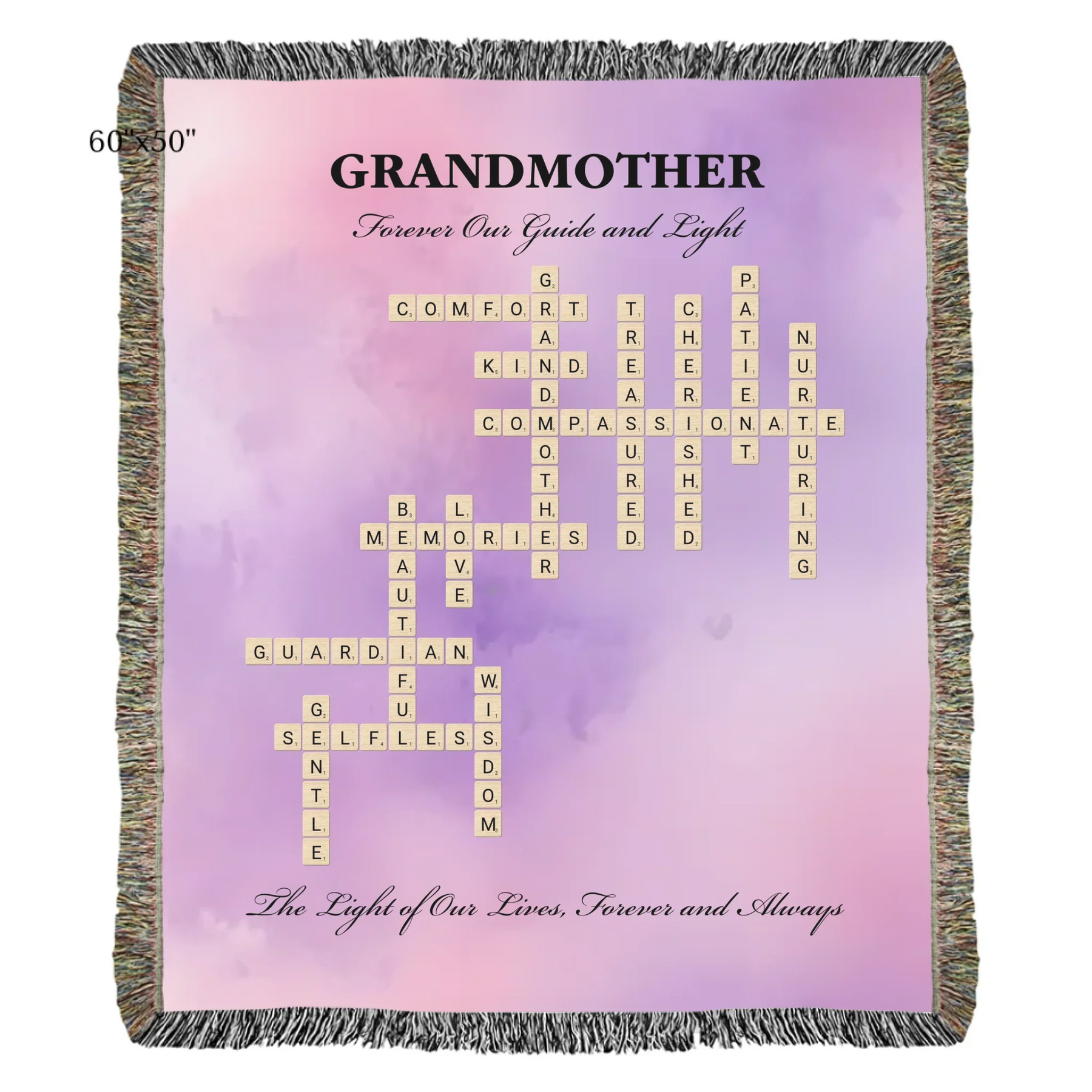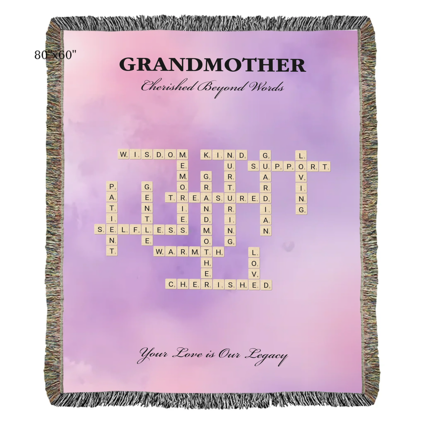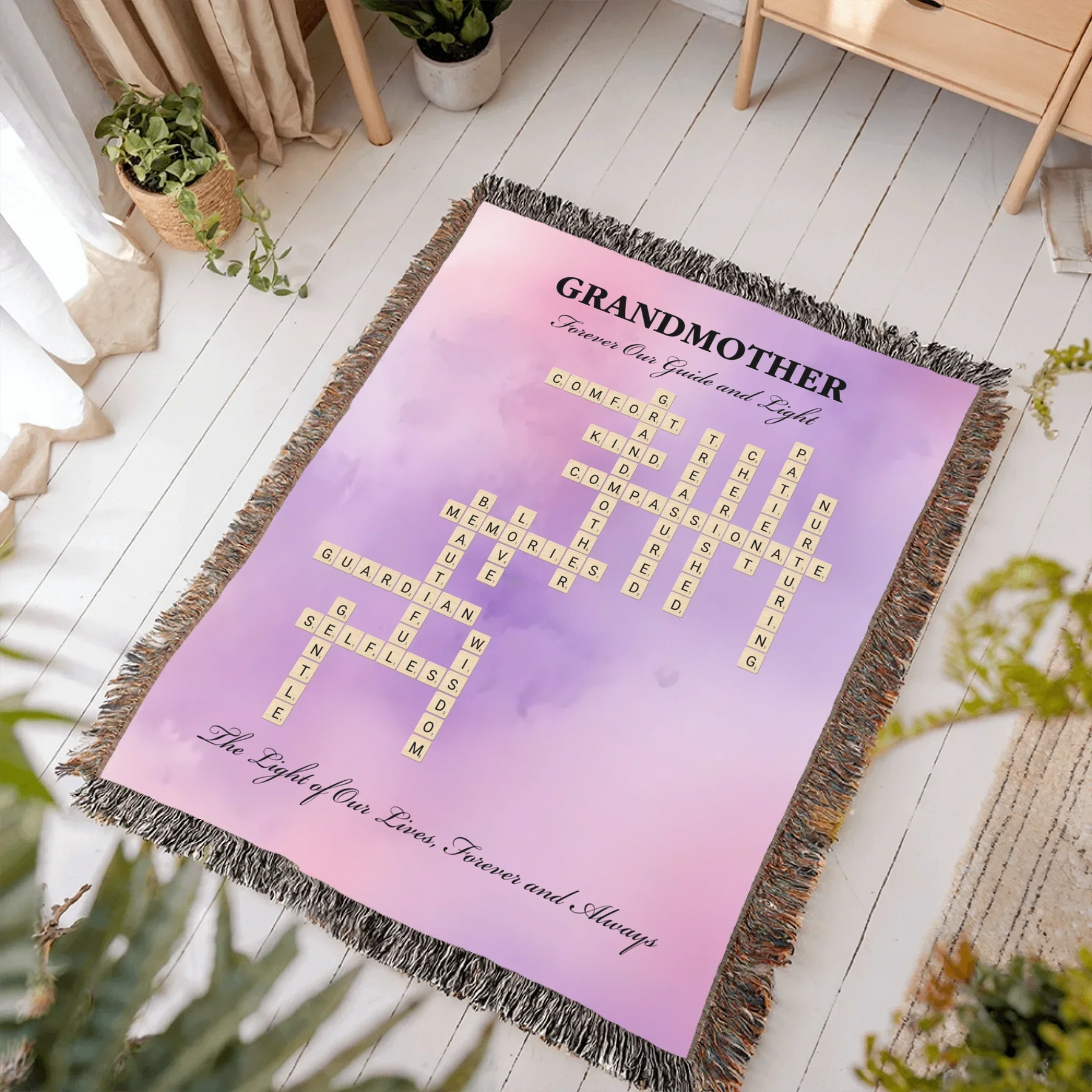 Honor the love and warmth of a mother with this Custom Grandmother Word Tile Blanket. Featuring two design options, Curated Words for Grandmother, a pre-designed word puzzle with carefully chosen words that celebrate grandma, or Build Your Own Word Art, allowing you to fully personalize each word. This beautifully crafted grandmother blanket can be customized with up to 100 names or words in a letter tile layout, tile color, font color, background color, as well as a title, subtitle, and footer text for a truly unique keepsake. Perfect for Mother’s Day, birthdays, or just as a heartfelt reminder of your love and gratitude.