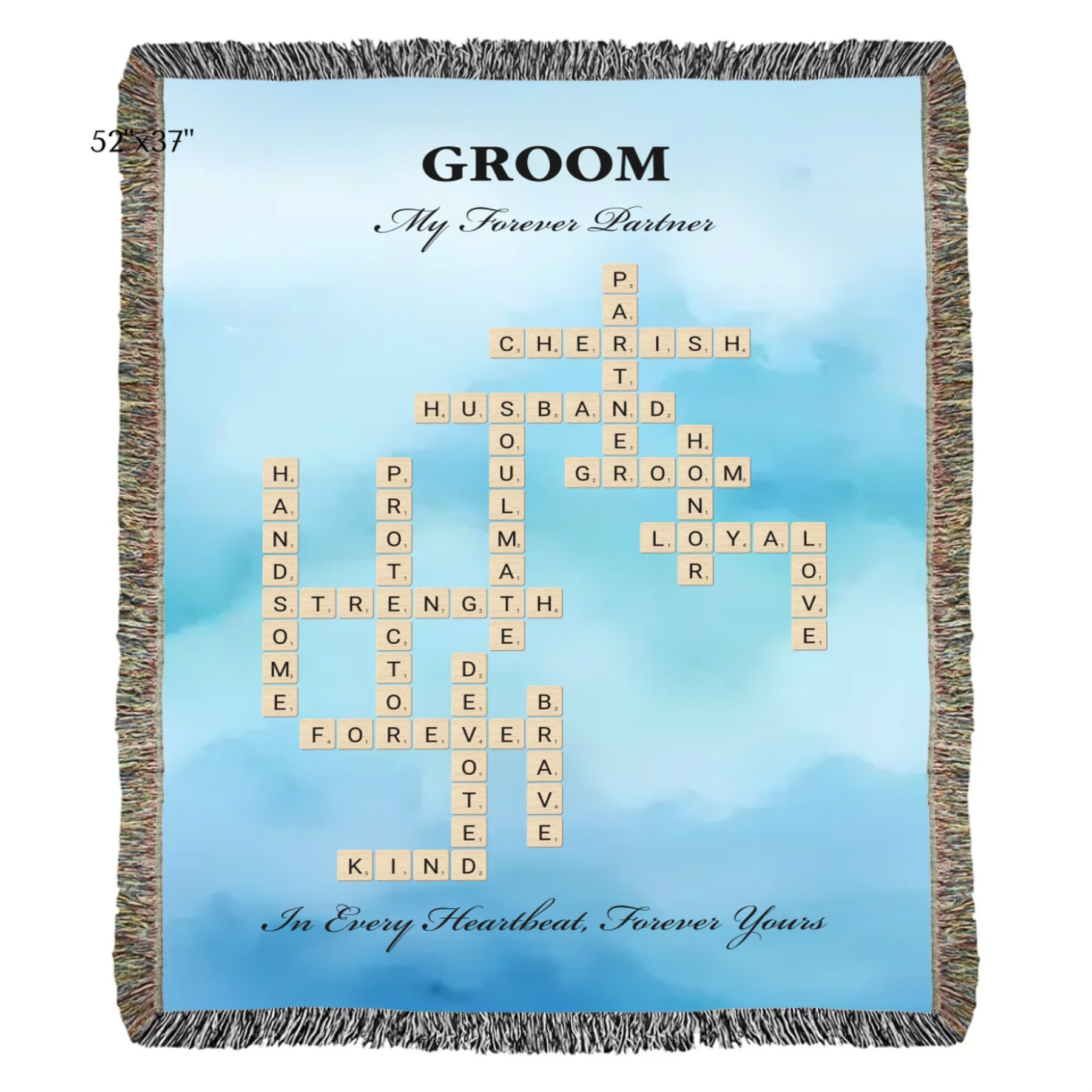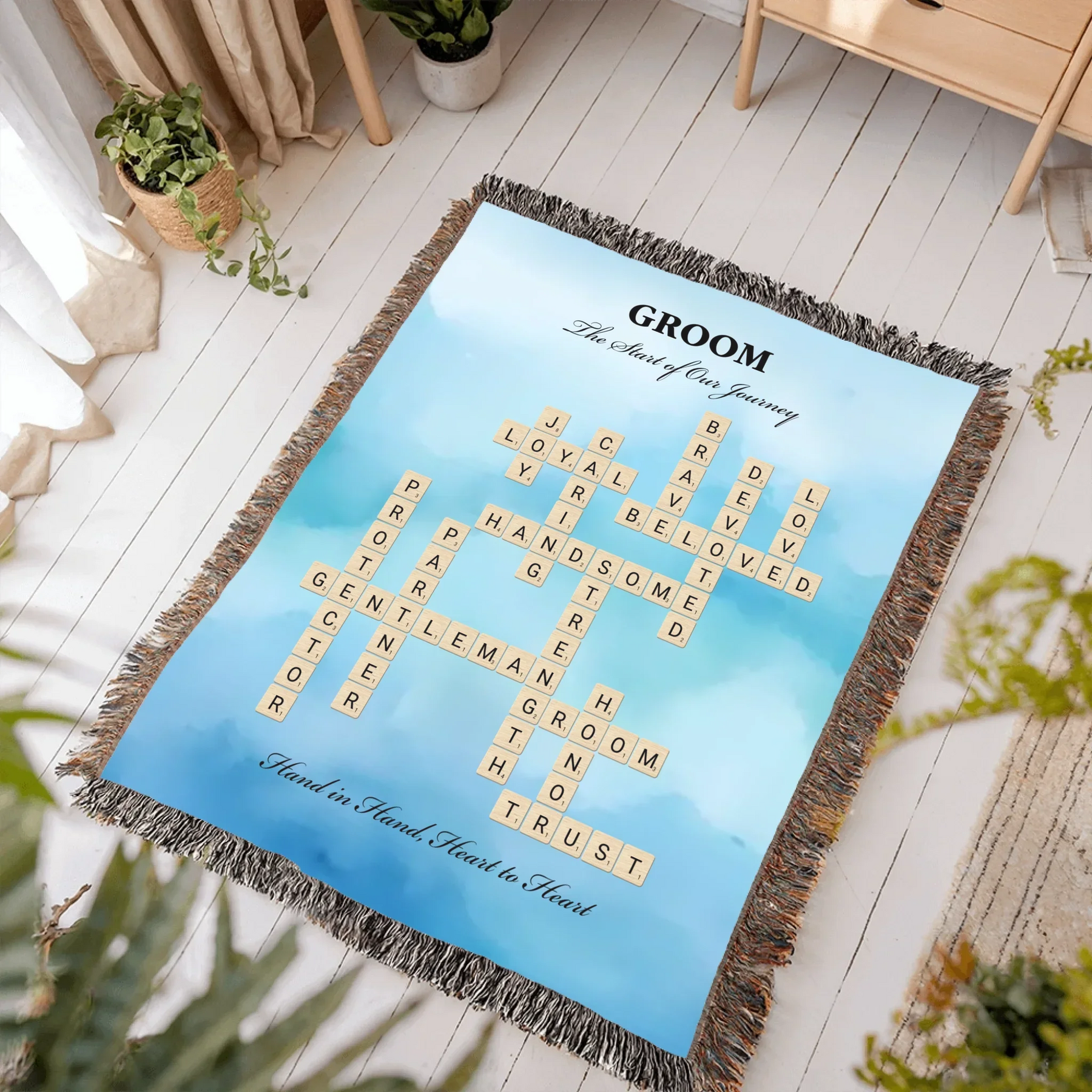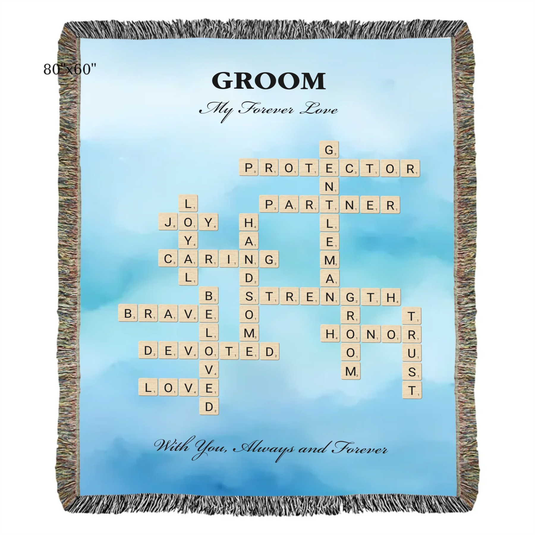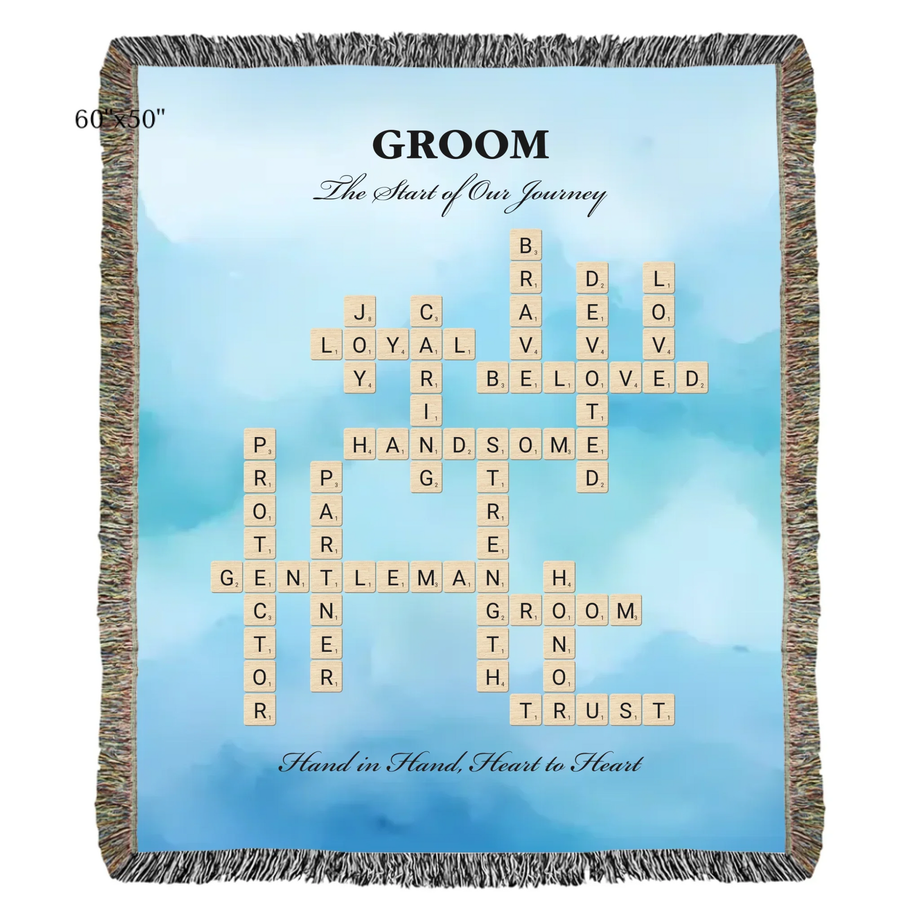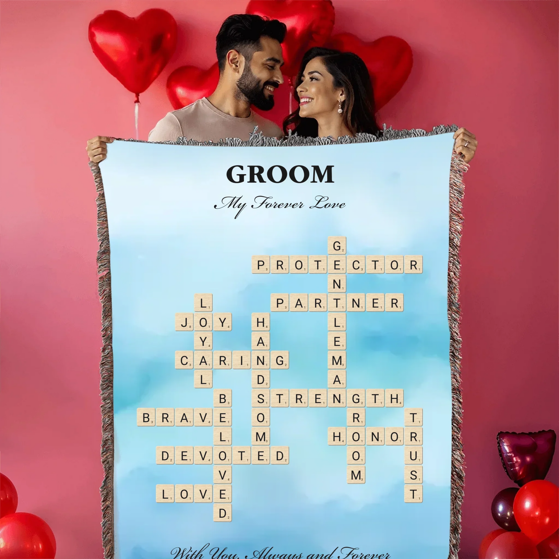 Celebre el amor y el compromiso con nuestra manta personalizada con palabras para el novio, diseñada para celebrar el día especial del novio. Esta hermosa manta personalizada le permite elegir entre dos opciones de personalización: