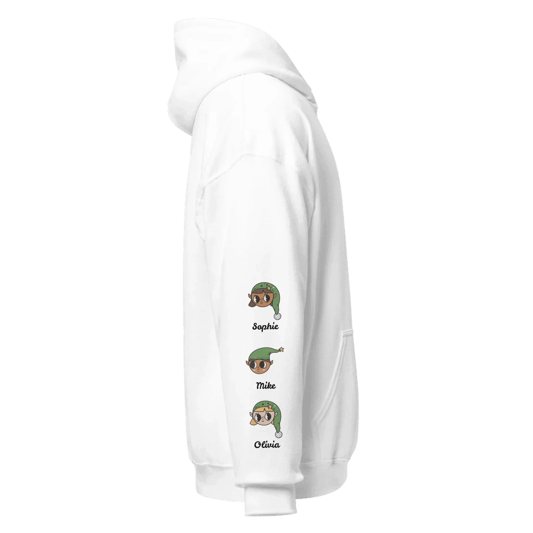 This sweatshirt or hoodie offers optional personalization on both sleeves. Each sleeve can include custom elf icons with names underneath them. You may add up to seven elves per sleeve, making this the perfect holiday gift for moms, grandmas, or anyone who cherishes their “little elves.” It is ideal for family photos, Christmas gatherings, and meaningful winter gifts.