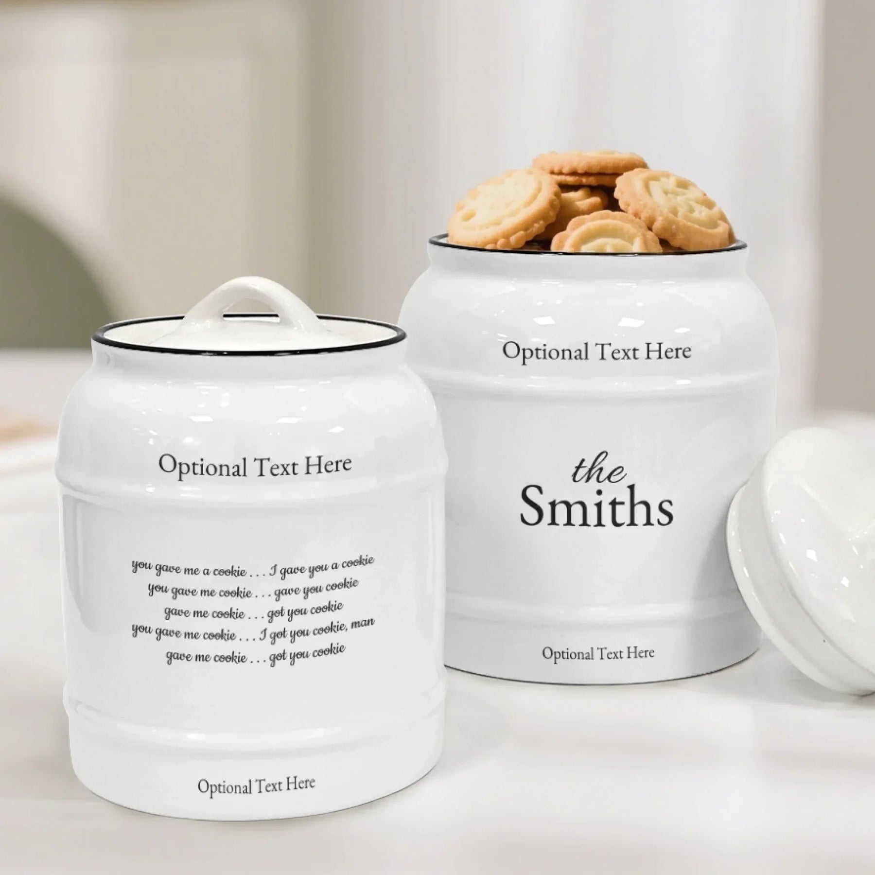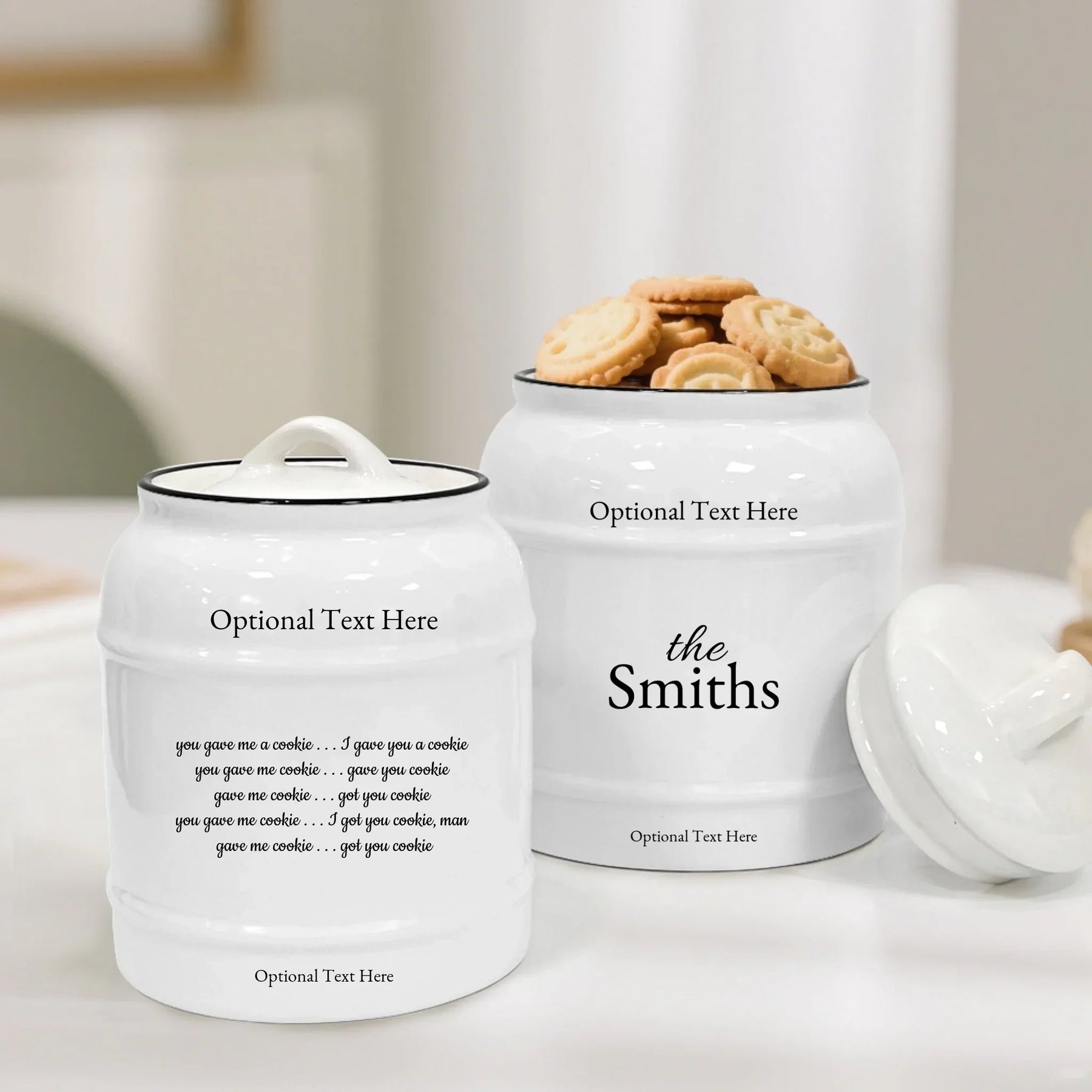 Create a meaningful centerpiece for your kitchen with this Custom Paragraph Text Ceramic Cookie Jar. This unique design features a full paragraph of custom text on one side and a bold, elegant “the Custom NAME” design on the other side. The large serif name design creates a classic, timeless look. Many customers choose family names such as “the Smiths,” “the Garcias,” or “the Millers.” The paragraph side lets you share a heartfelt message, a family story, a recipe, or a meaningful dedication.
