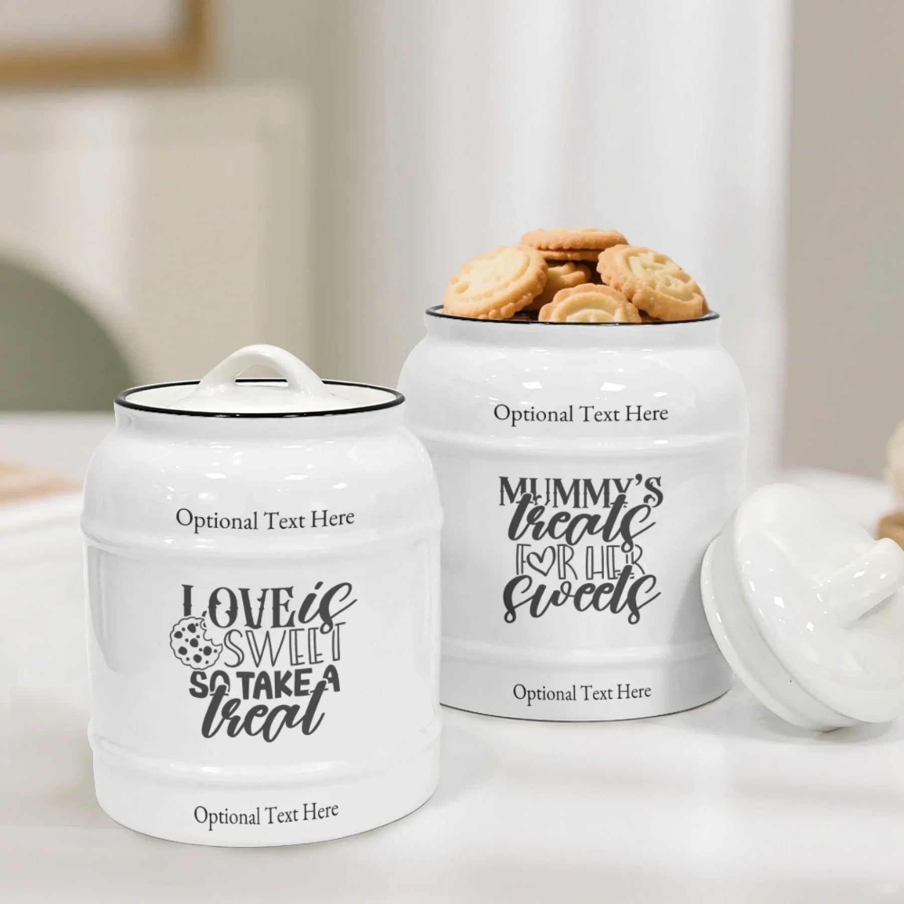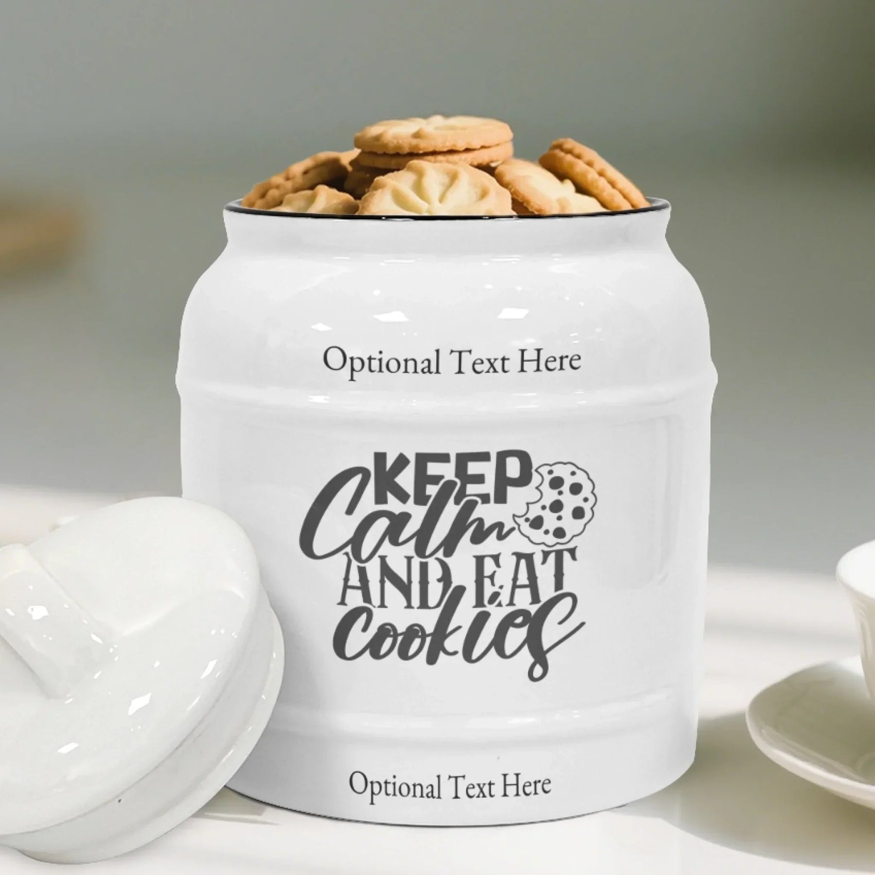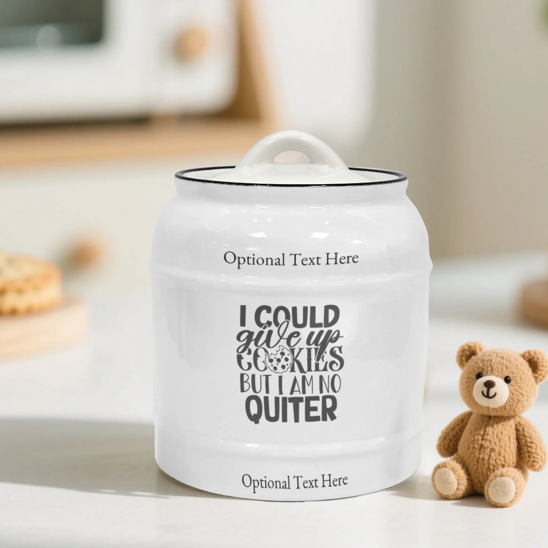 Elevate your kitchen décor with a custom cookie jar that blends personality, charm, and everyday function. This Custom Quotes Ceramic Cookie Jar offers a stylish way to store your favorite treats while showcasing a meaningful message that reflects your home and family. This design features 19 unique cookie-themed quotes, each created with bold, modern typography for maximum visual appeal. You can choose one quote for each side of the jar or mix and match two different quotes for a personalized look.