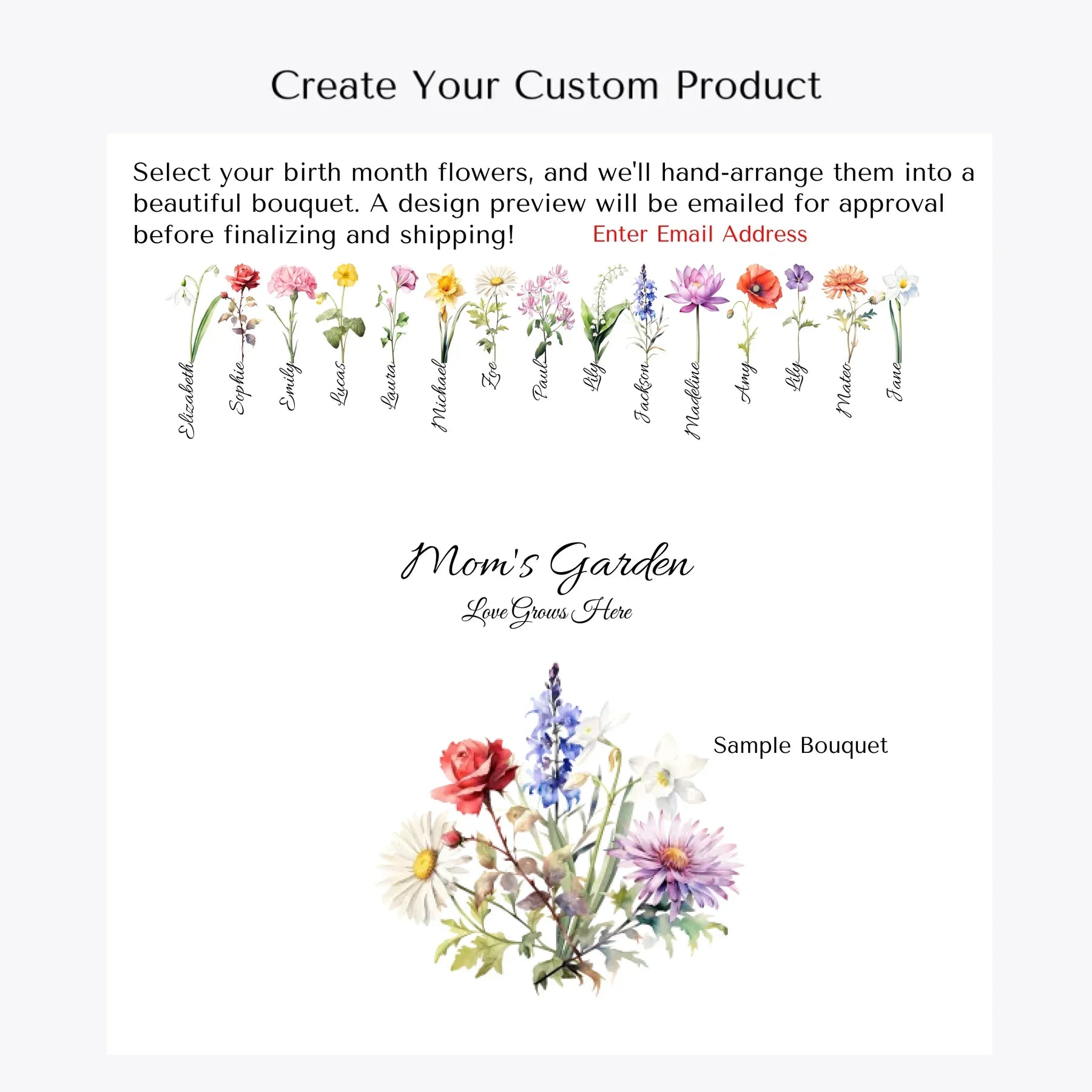 El diseño incluye flores personalizadas de acuarela para cada mes de nacimiento . Selecciona hasta 15 flores de cualquier mes para crear un ramo personalizado. Añade nombres con cada flor, colocándolos junto a la flor o debajo de la ilustración. Personaliza la fuente y el color del texto, y opcionalmente incluye un título o subtítulo como "El Jardín de Mamá" o " Floreciendo desde el año 2000" .
