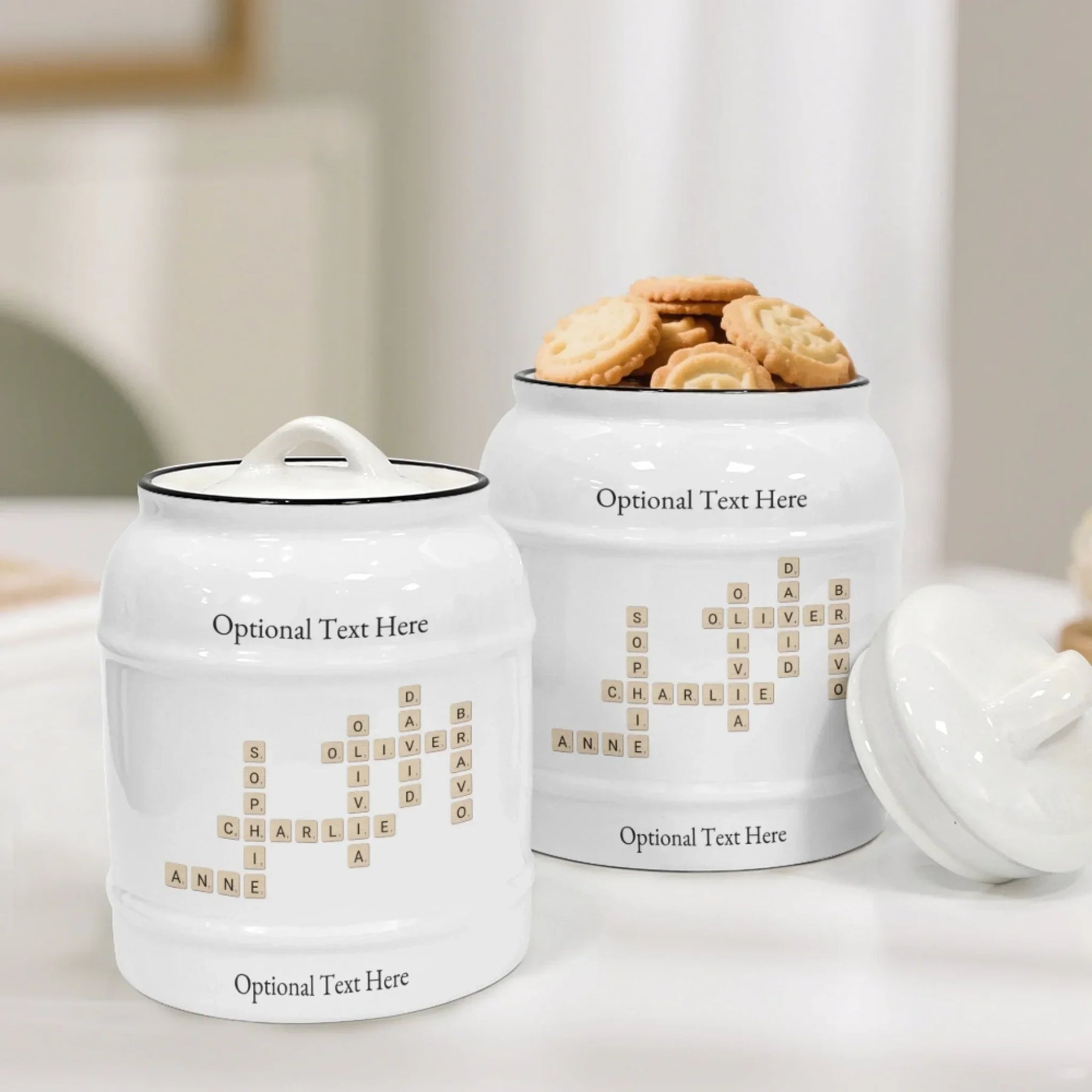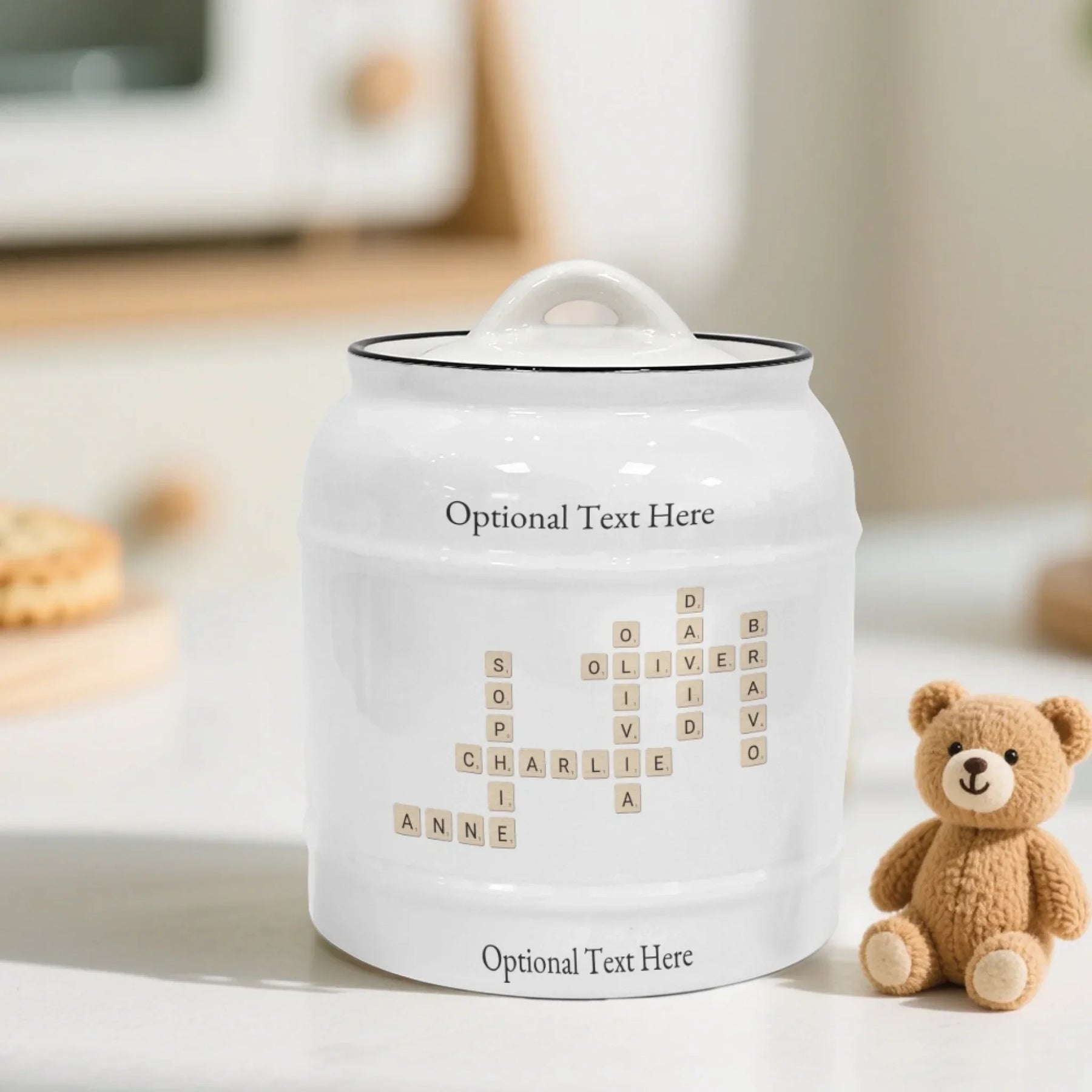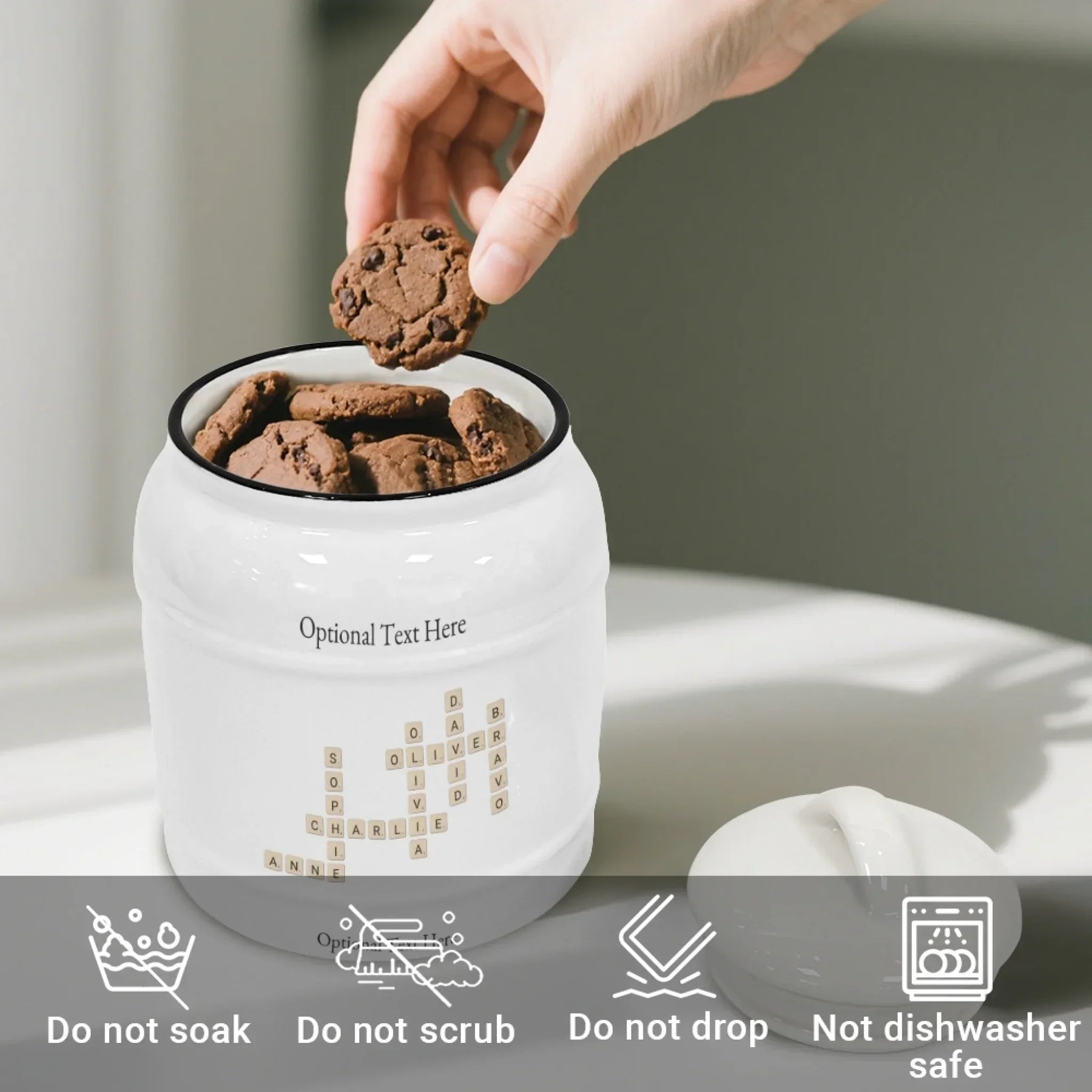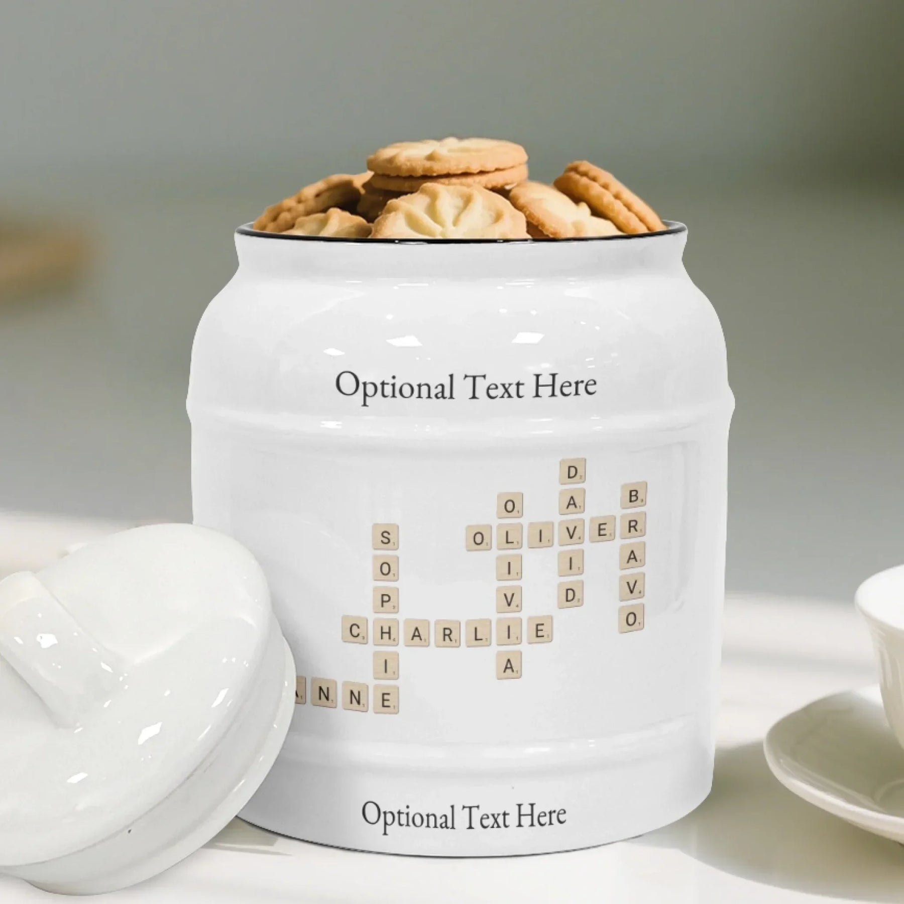 Create a meaningful and stylish kitchen accent with this Custom Word Tile Ceramic Cookie Jar, designed to showcase your favorite names, words, or short phrases in a classic letter-tile layout. Personalize the jar with any arrangement of words to form a unique pattern. Add optional top and bottom text for your family name, a date, or a short message. This jar blends clean design with warm personalization, making it perfect for display in any kitchen, coffee nook, or living space.