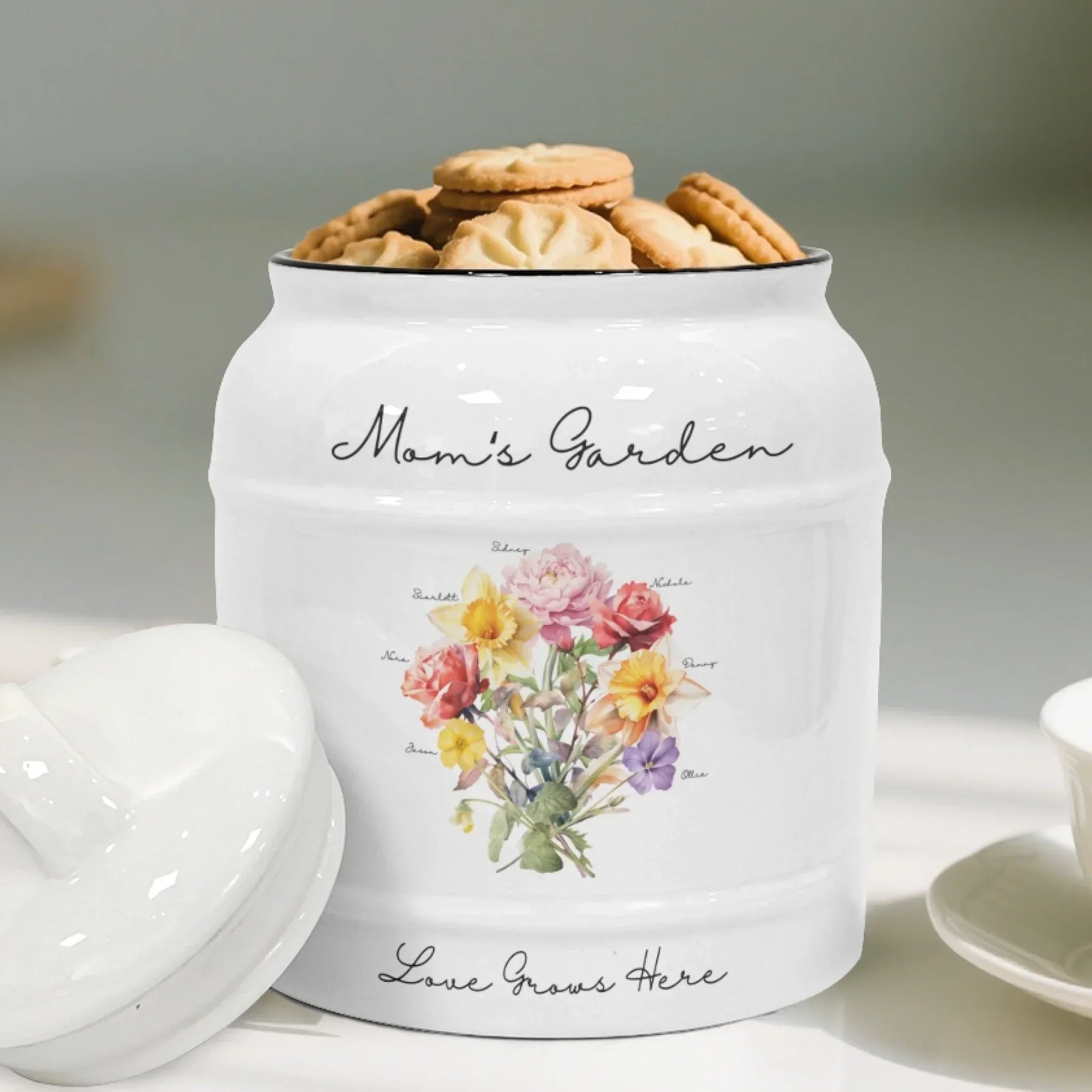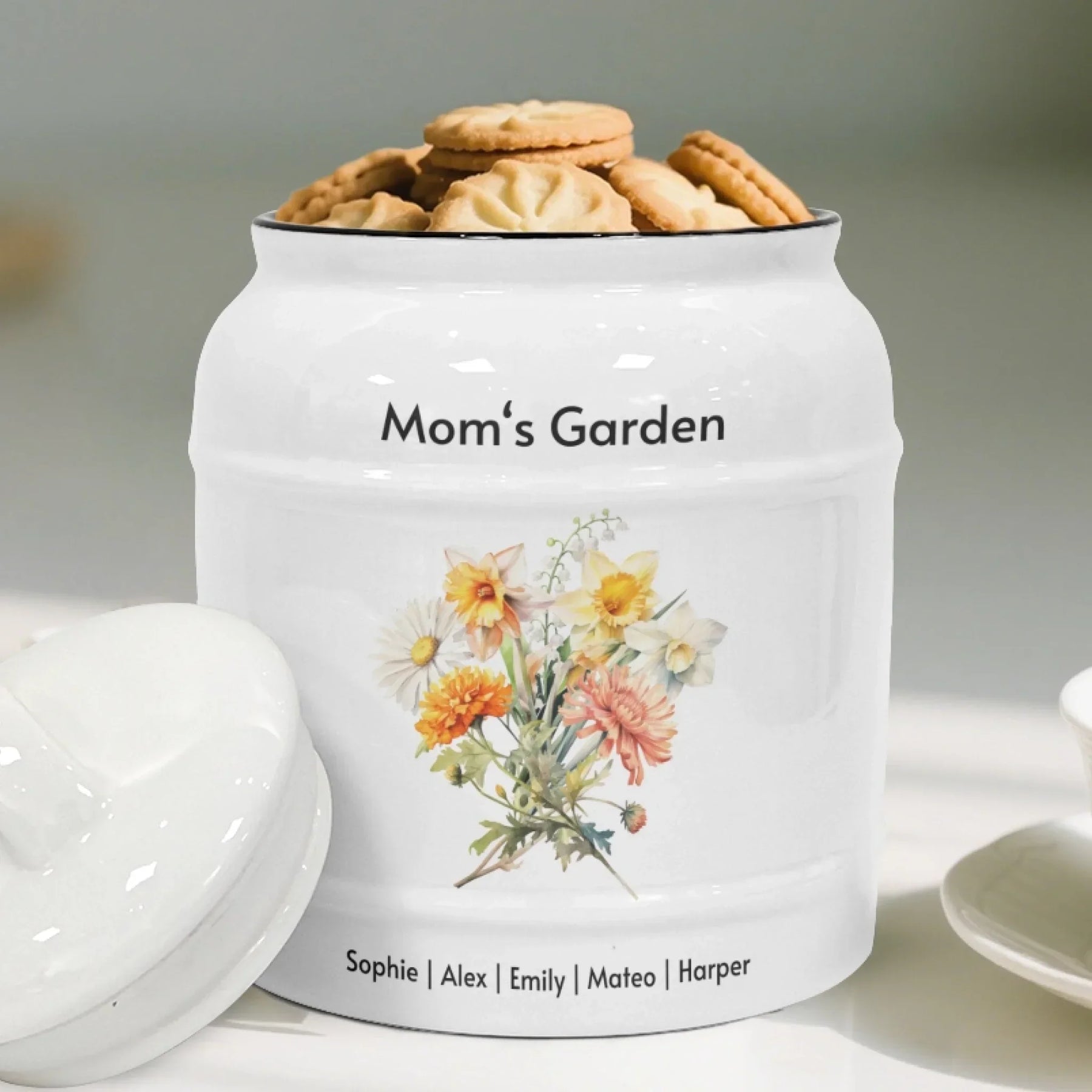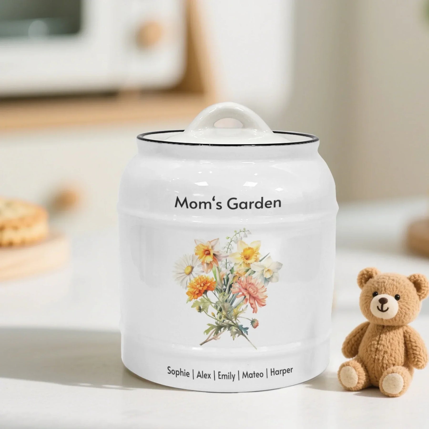 This personalized cookie jar makes a heartfelt gift for many occasions. It is perfect for Mother’s Day, birthdays, anniversaries, Christmas, and family reunions. Grandmothers love receiving a bouquet made from all their grandchildren’s birth month flowers. Mothers enjoy seeing a floral arrangement created from their children’s birth months. Couples appreciate having a keepsake that symbolizes their family journey. It is also a beautiful memorial or remembrance piece for honoring loved ones.