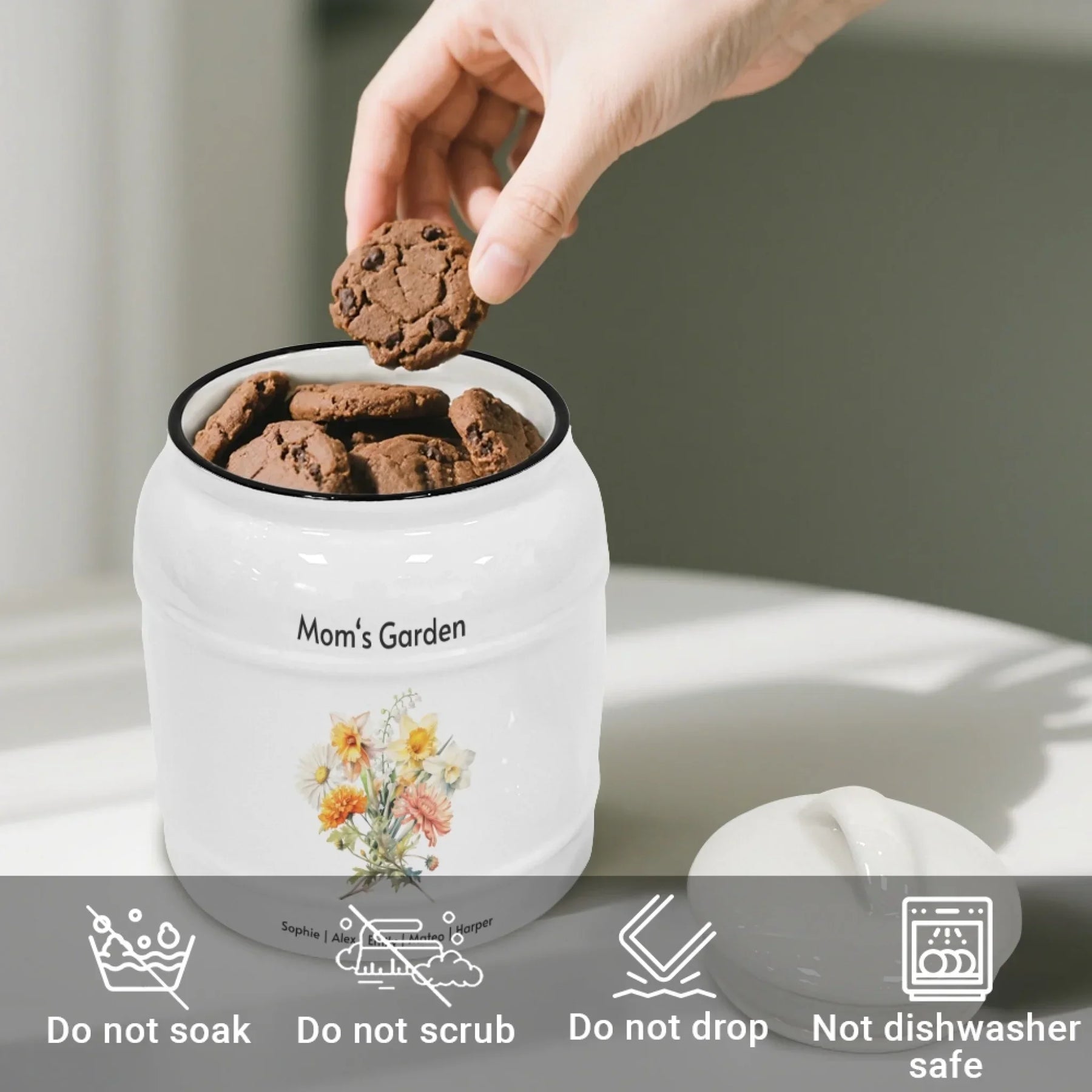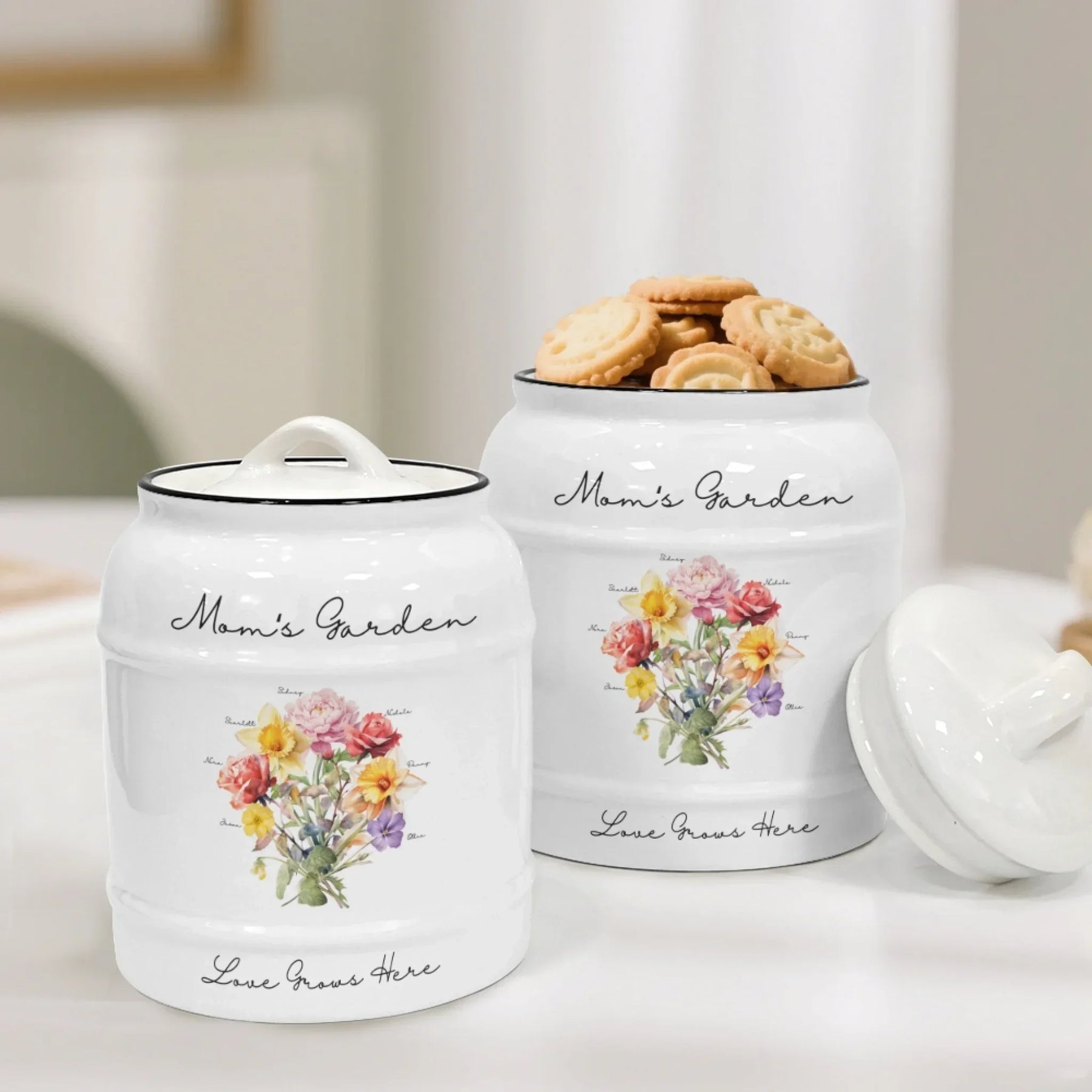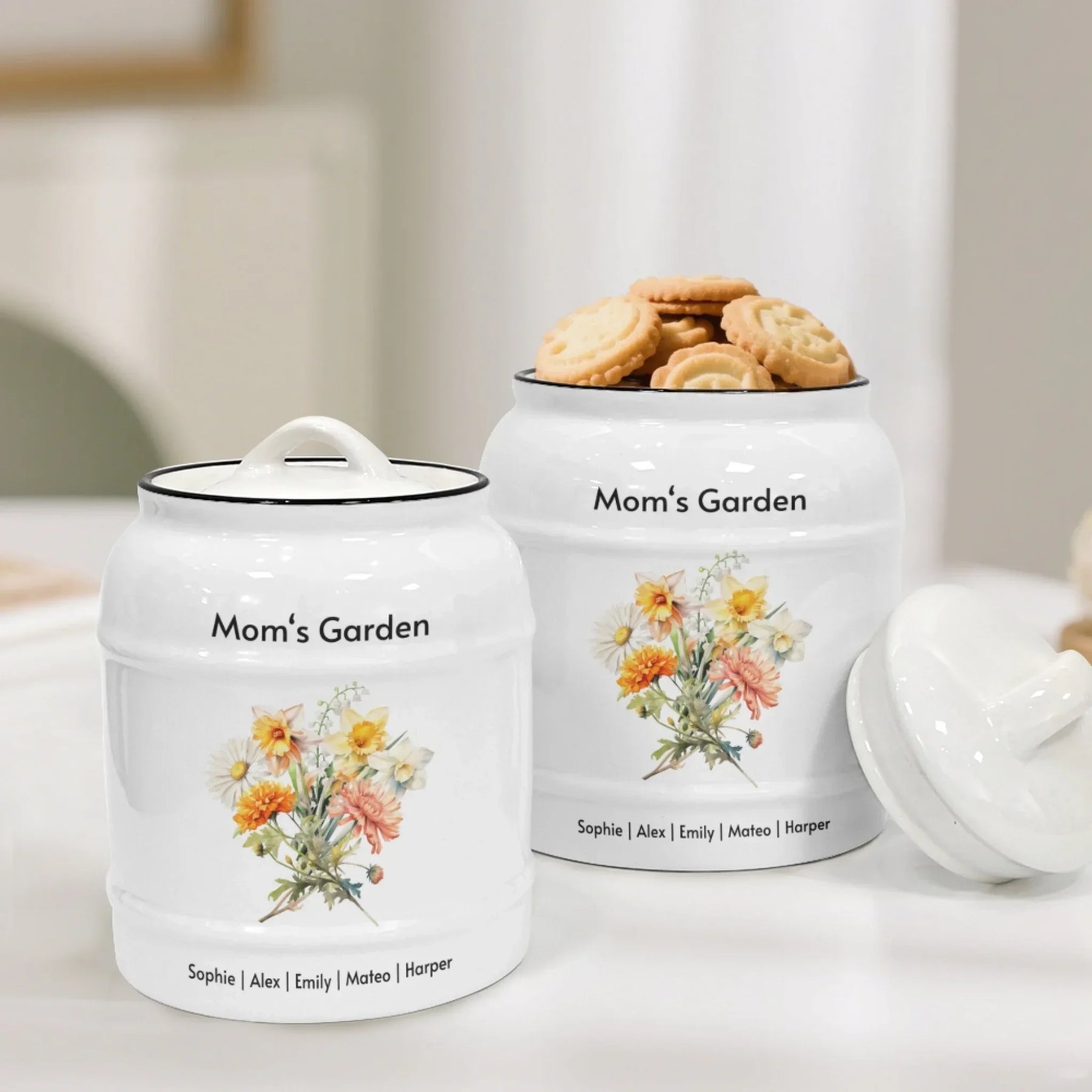 This personalized cookie jar makes a heartfelt gift for many occasions. It is perfect for Mother’s Day, birthdays, anniversaries, Christmas, and family reunions. Grandmothers love receiving a bouquet made from all their grandchildren’s birth month flowers. Mothers enjoy seeing a floral arrangement created from their children’s birth months. Couples appreciate having a keepsake that symbolizes their family journey. It is also a beautiful memorial or remembrance piece for honoring loved ones.