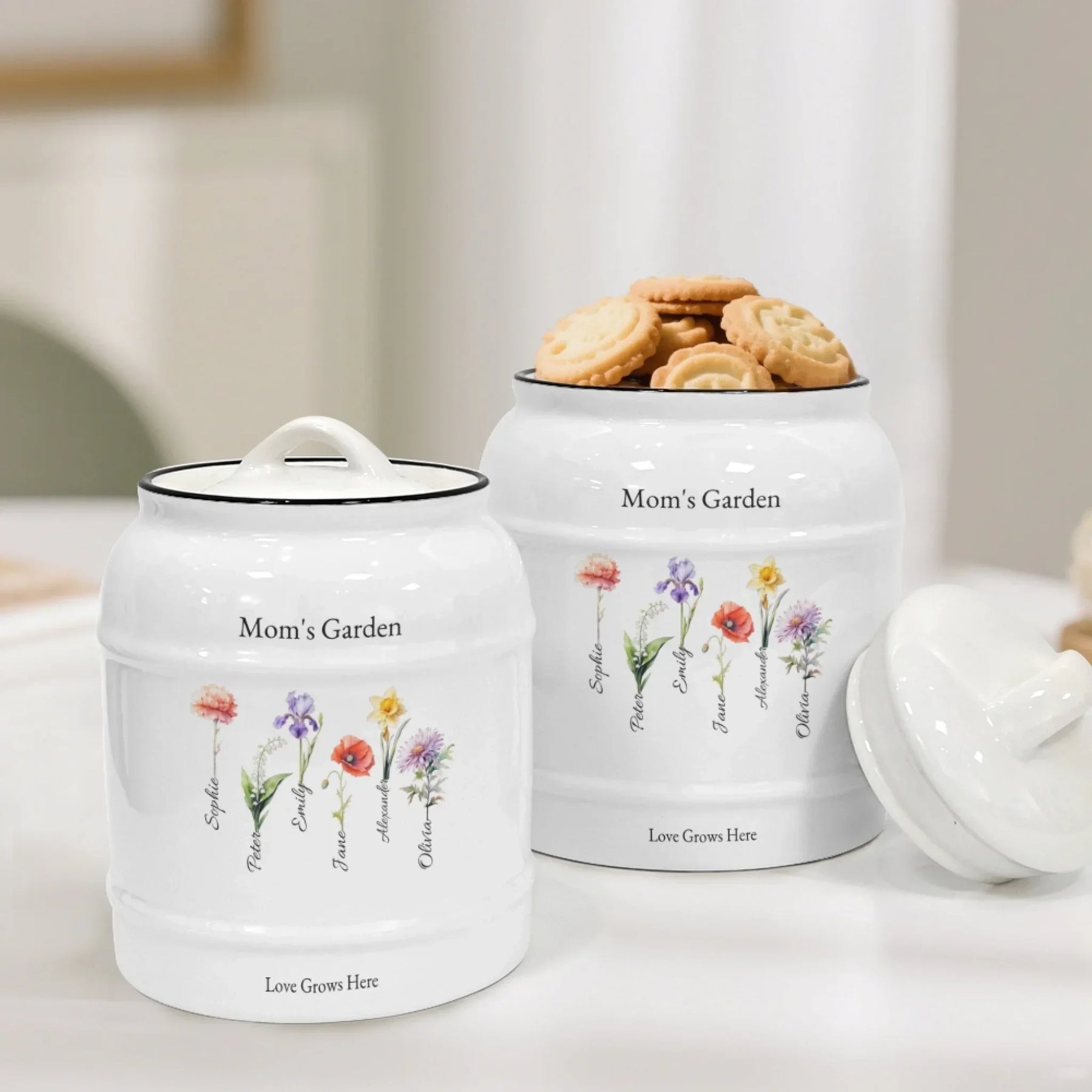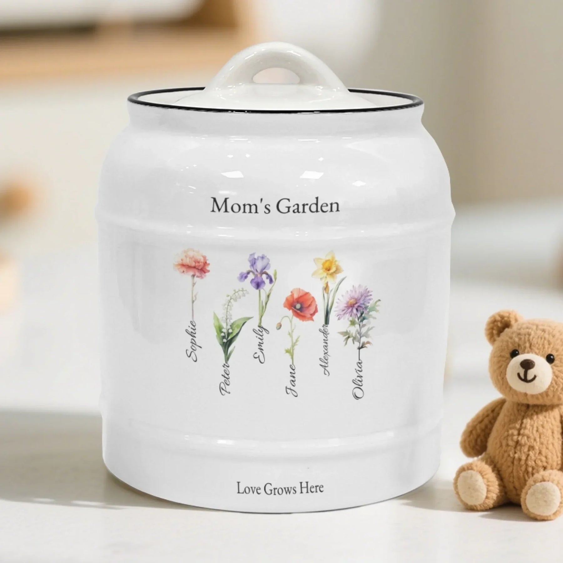 This cookie jar becomes even more special with personalization. You select your birth month flowers from a variety of floral illustrations. Each month includes several flowers, giving you creative freedom. Mix and match up to twenty-one blooms to represent children, grandchildren, siblings, or loved ones. The staggered floral layout creates a natural garden feel. Your chosen names blend seamlessly under each stem. You can also pick any title or footer to mark milestones or meaningful messages. Customize the fonts and colors to create a jar that is truly yours.
