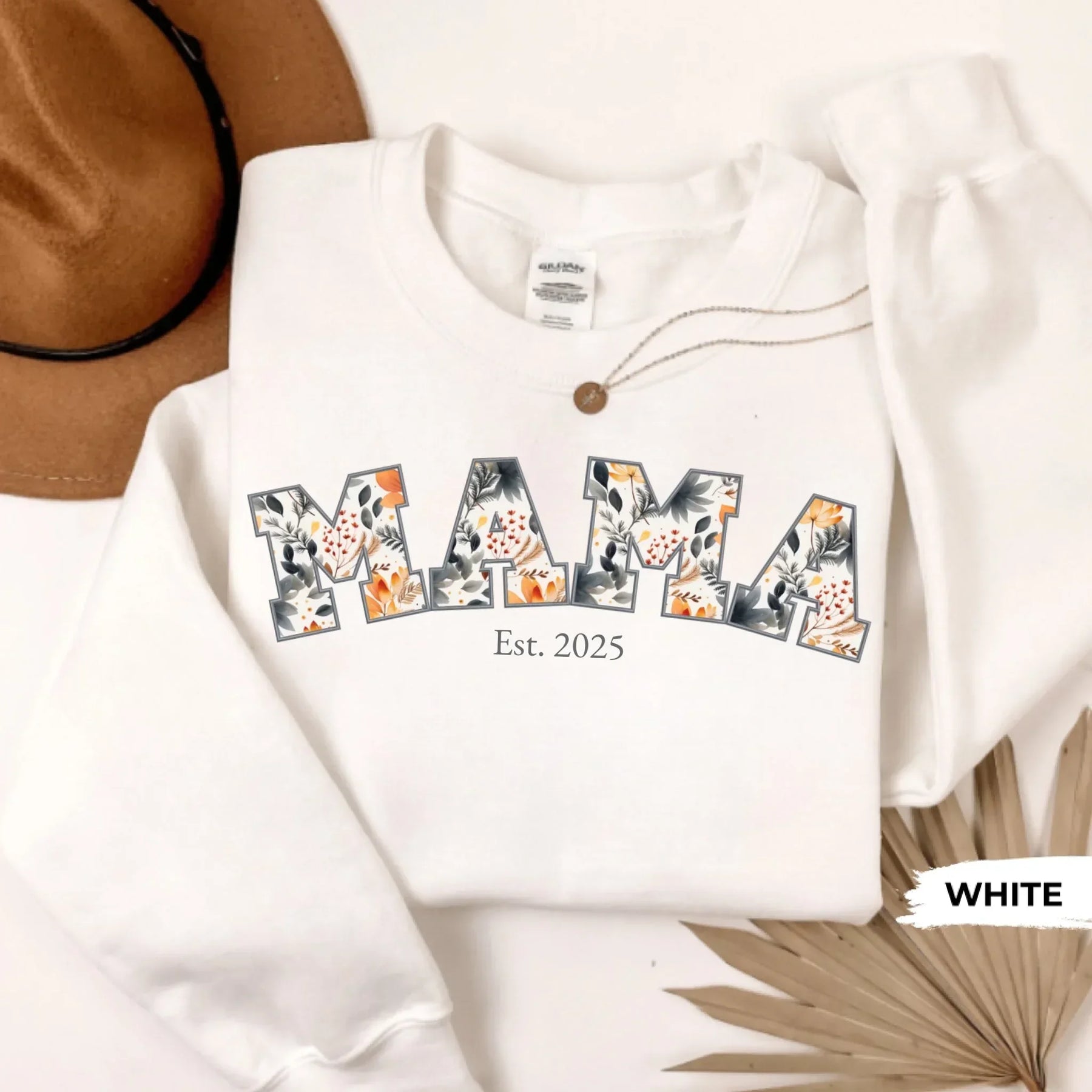 Wrap yourself in the warmth of autumn with the Fall Floral MAMA Sweatshirt, designed to celebrate motherhood and cozy fall vibes. The design features floral varsity letters spelling “MAMA” in a beautiful palette of rich autumn hues — deep orange, mustard yellow, and muted green — with your personalized Est. Year elegantly placed underneath.