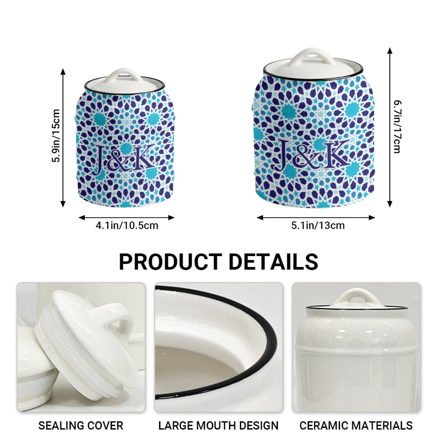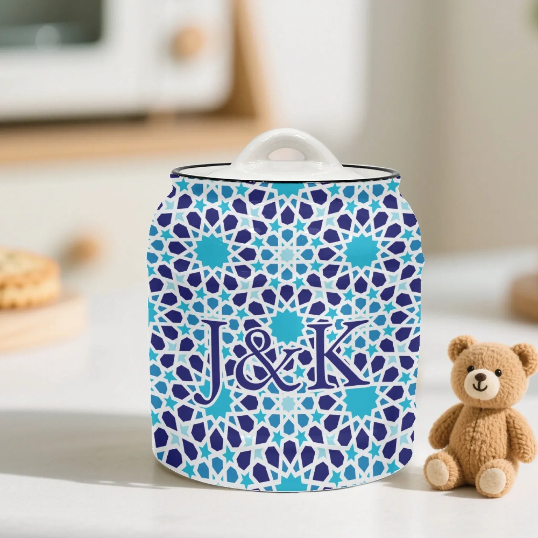This Custom Moroccan Geometric Art Ceramic Cookie Jar brings timeless pattern work and modern functionality together in a clean, elegant way. The design features your choice of fourteen Moroccan geometric patterns. Each pattern reflects traditional craftsmanship with repeating shapes, fine details, and structured visual balance. These patterns add depth and sophistication to any kitchen, pantry, or countertop setting. The jar offers full customization, allowing you to personalize the text on both sides. You may include a single line, initials, or a multi-line message. The fonts and colors can be adjusted to match your preferred design style.