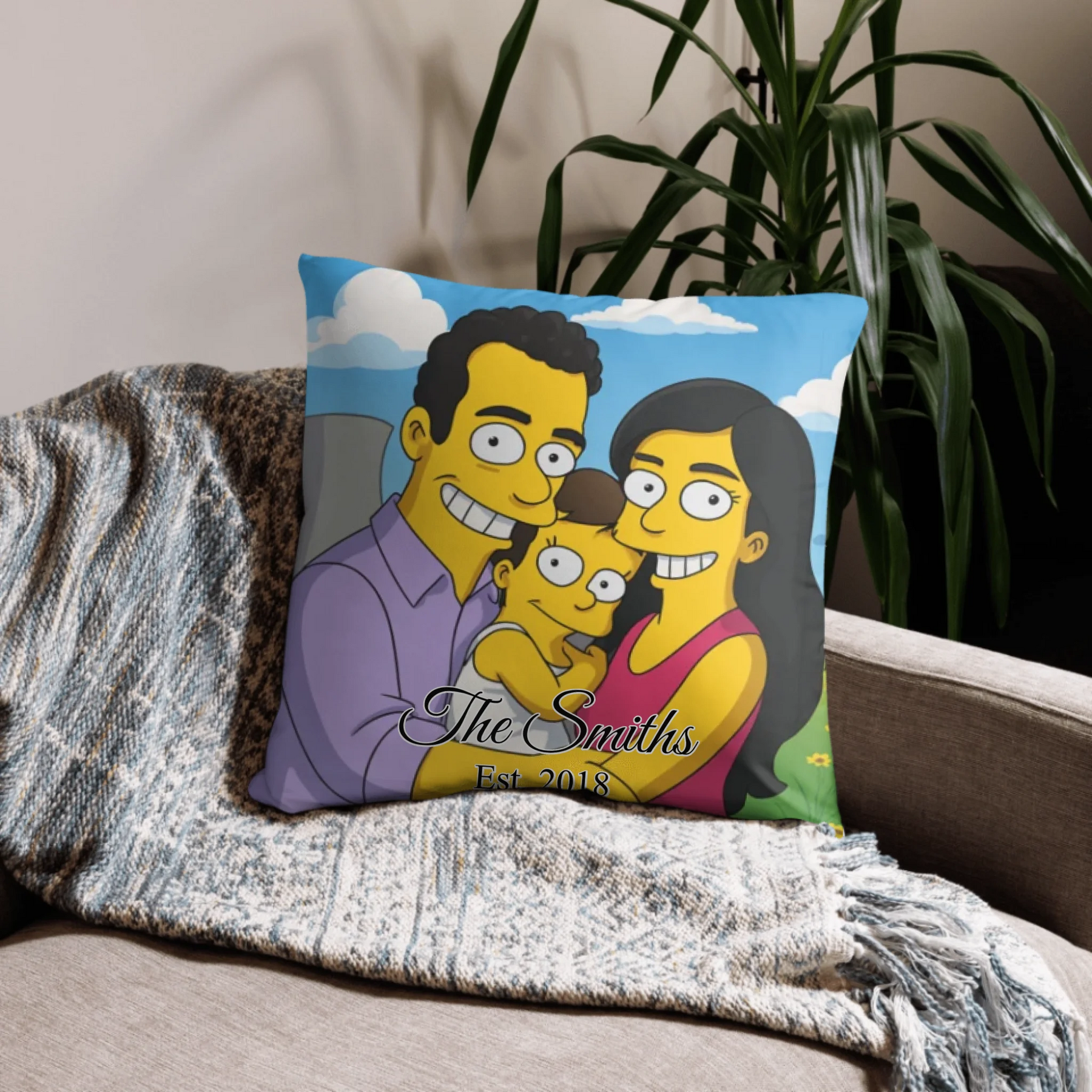 Our custom pillows transform your uploaded photo into a vibrant yellow cartoon-style portrait, creating a bold, modern, and eye-catching design. Your image is digitally illustrated in a clean cartoon format with enhanced lines, smooth shading, and a bright background that adds a distinctive artistic look to any space. You may add up to two lines of custom text at the bottom, with full control over font styles and colors for a meaningful and personalized finishing touch.