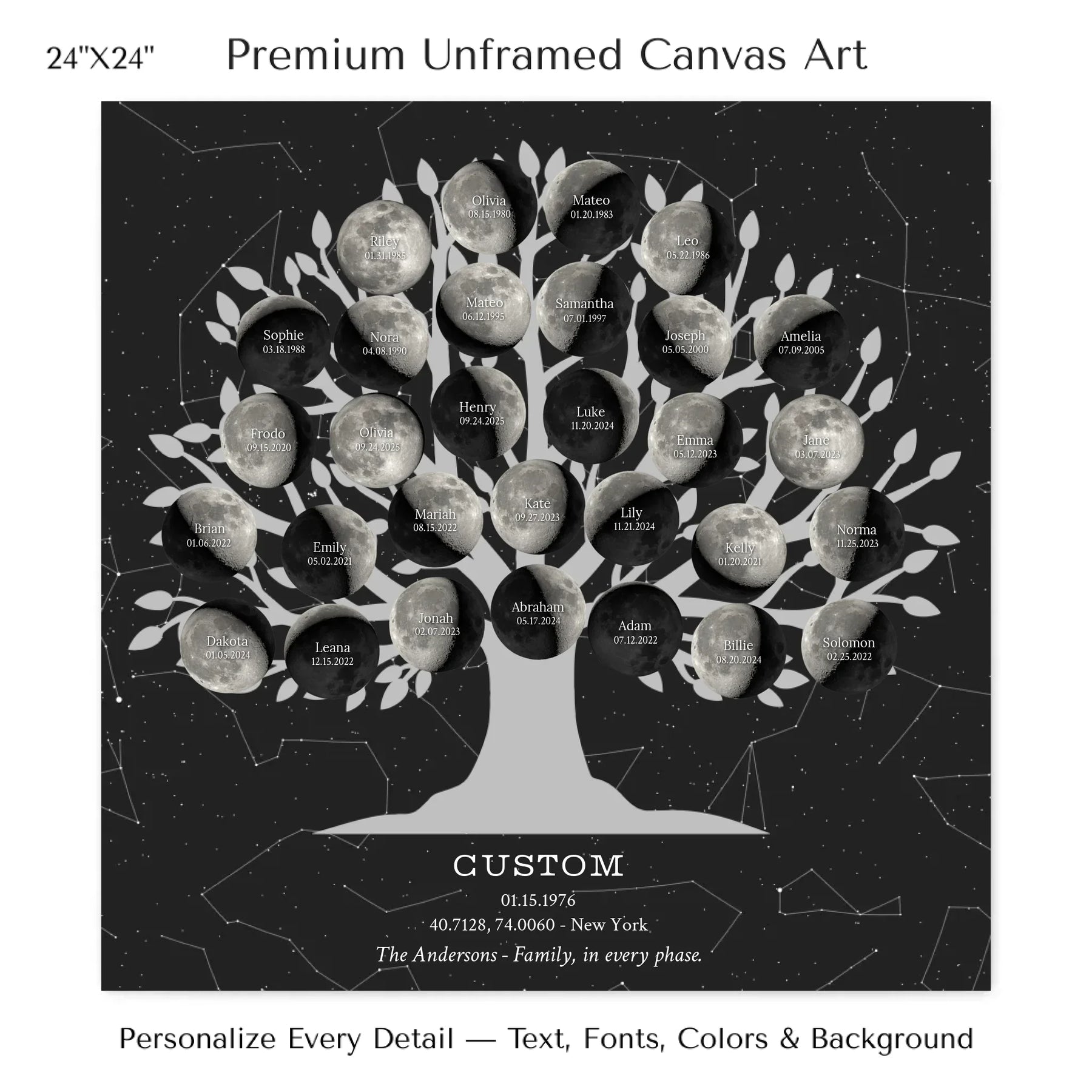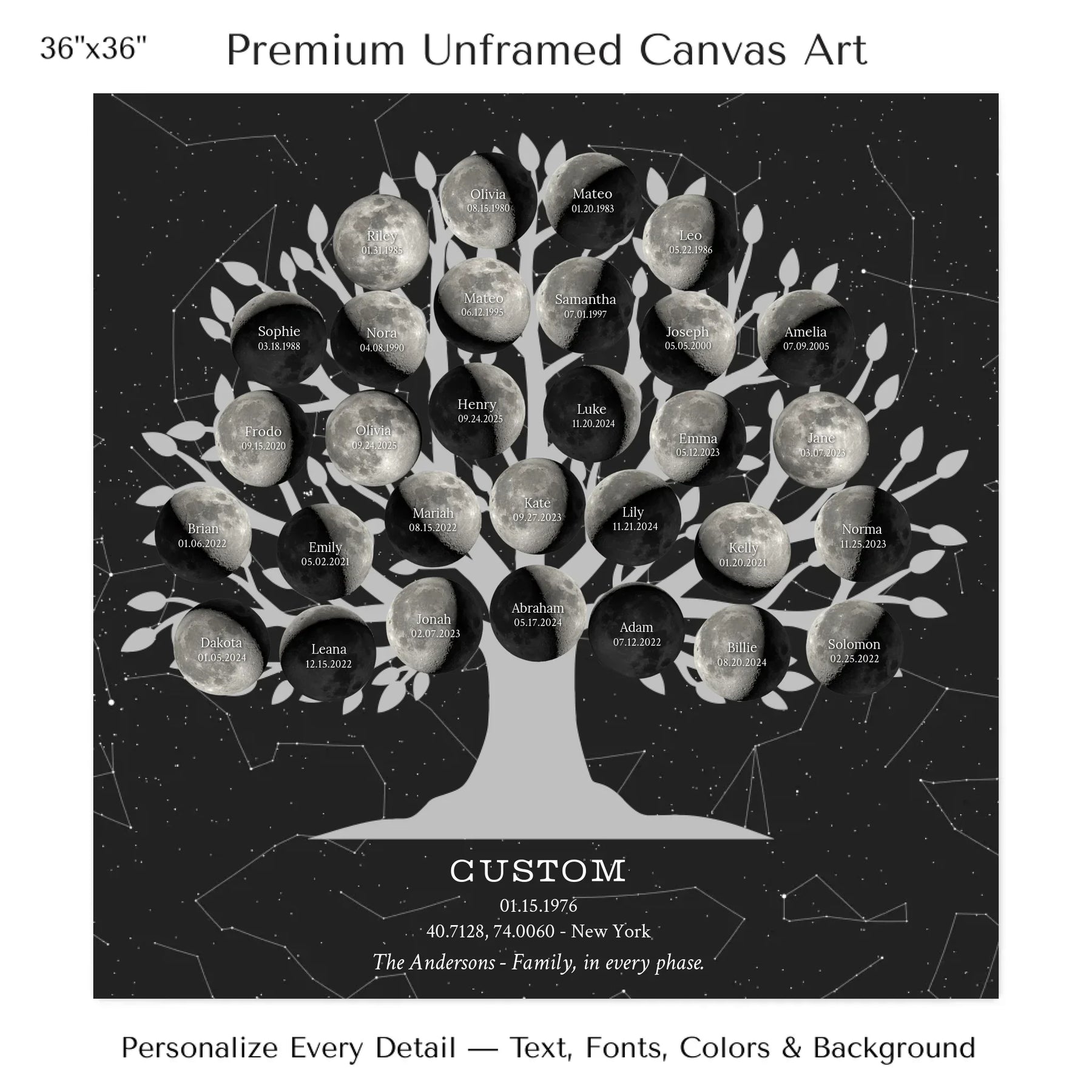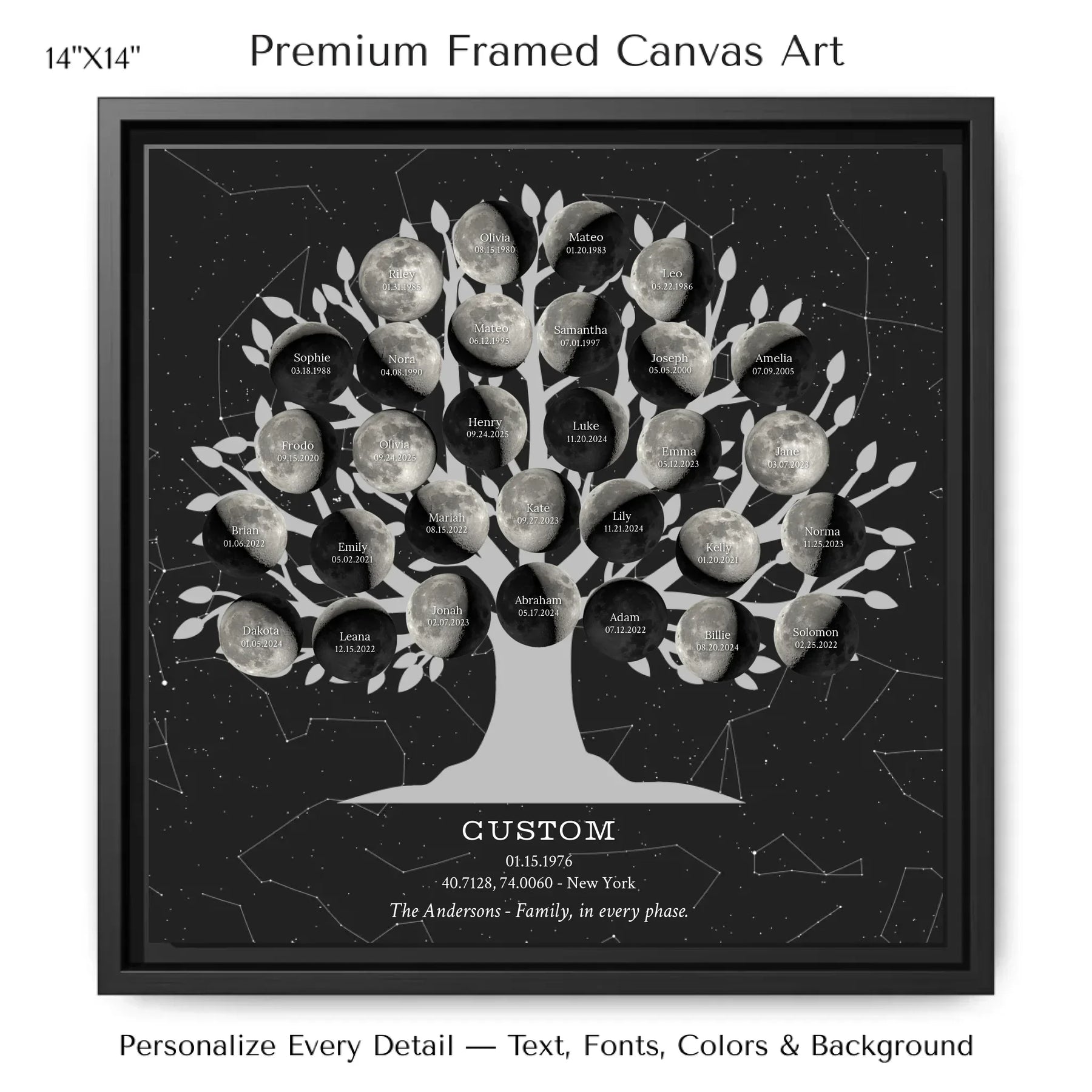 Transform your home with the timeless charm of a custom moon phase family tree wall print. At ARTFULANE, we offer a variety of designs and formats to enhance your space and tell your story. Whether you choose a framed or unframed canvas, framed poster, acrylic print, or metal wall decor, our custom pieces elevate any room with a personal touch. Perfect for your own home or as a thoughtful gift, each design can be personalized to fit your unique style or commemorate a special occasion.