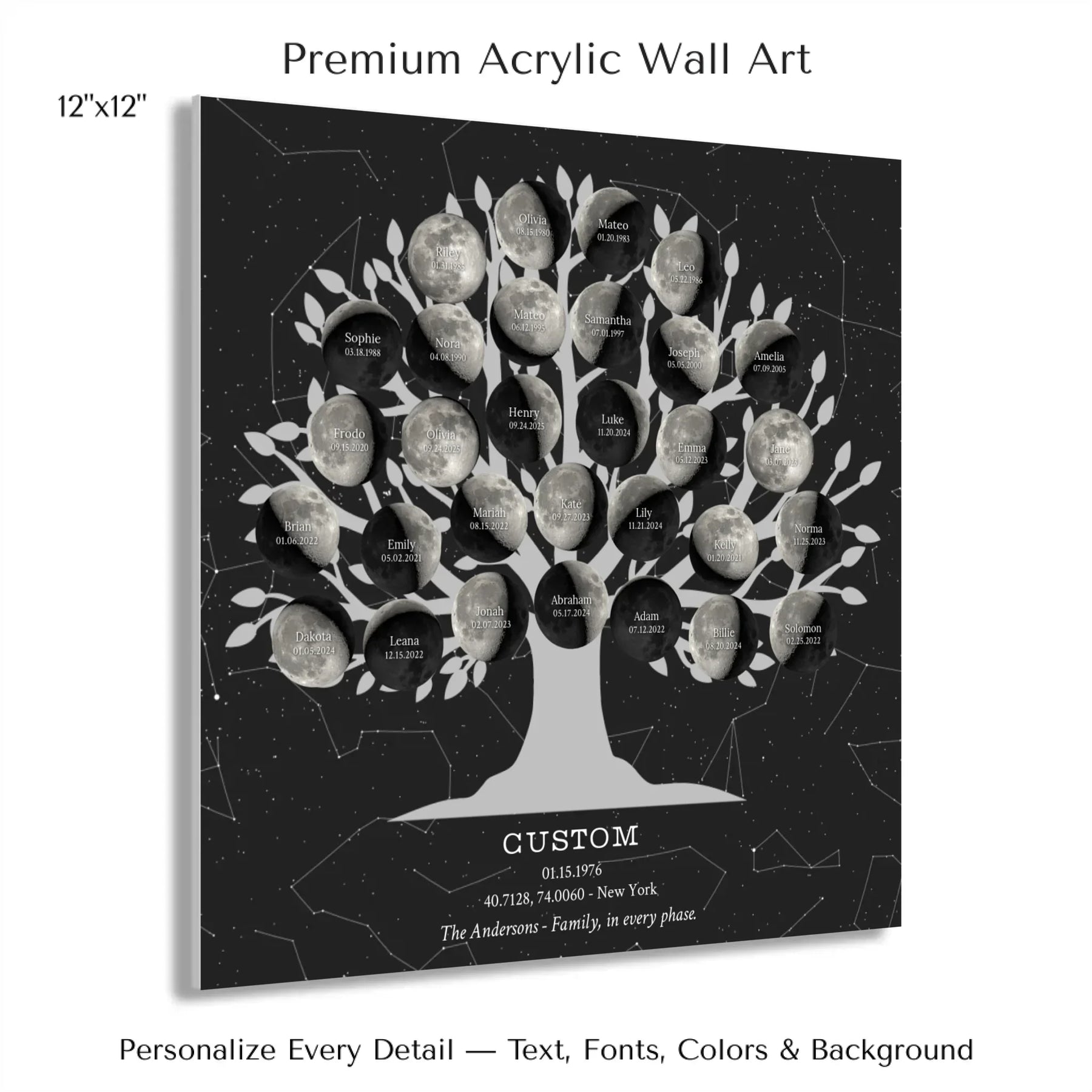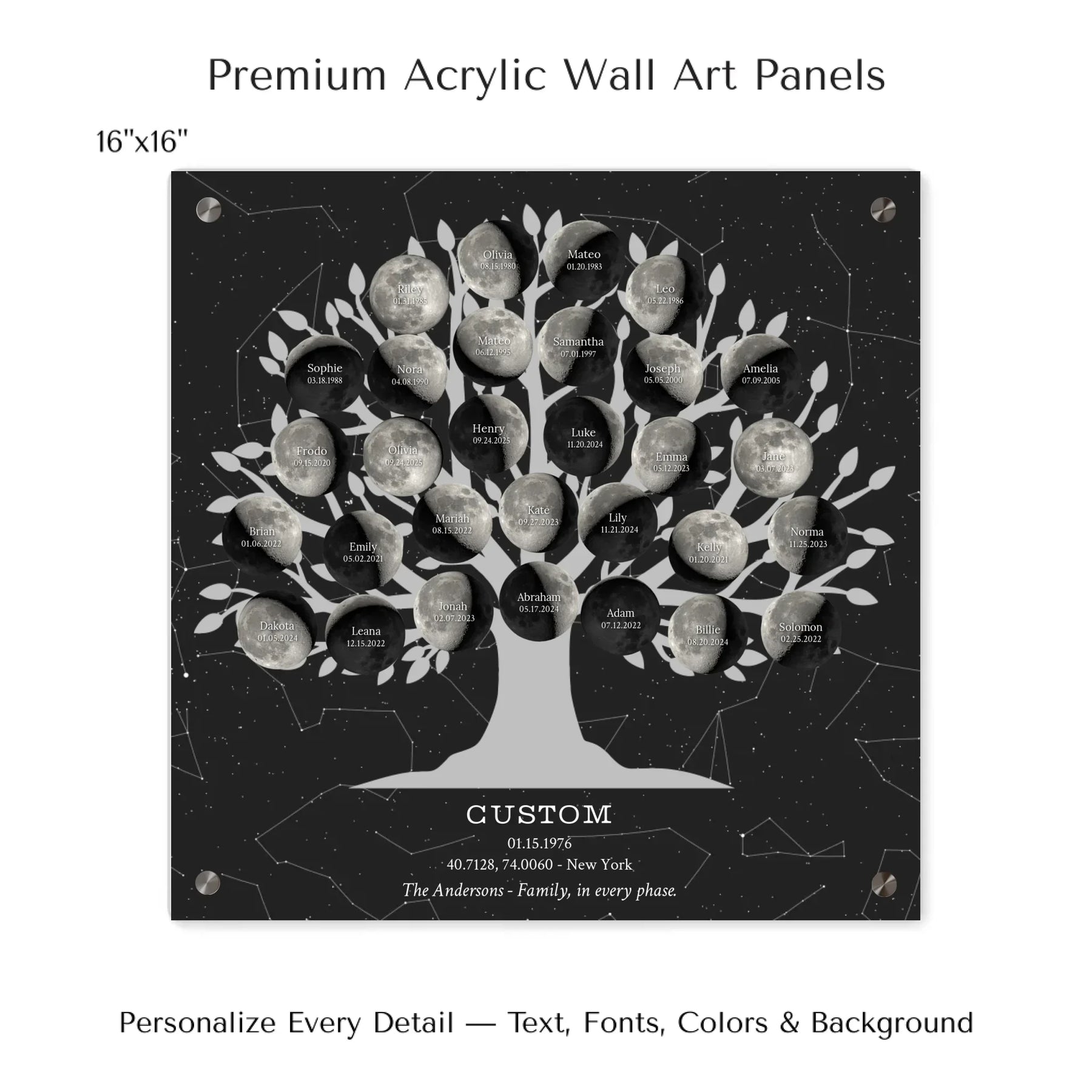Custom Silver Moon Phase Family Tree Wall Art – A Celestial Tribute to Family