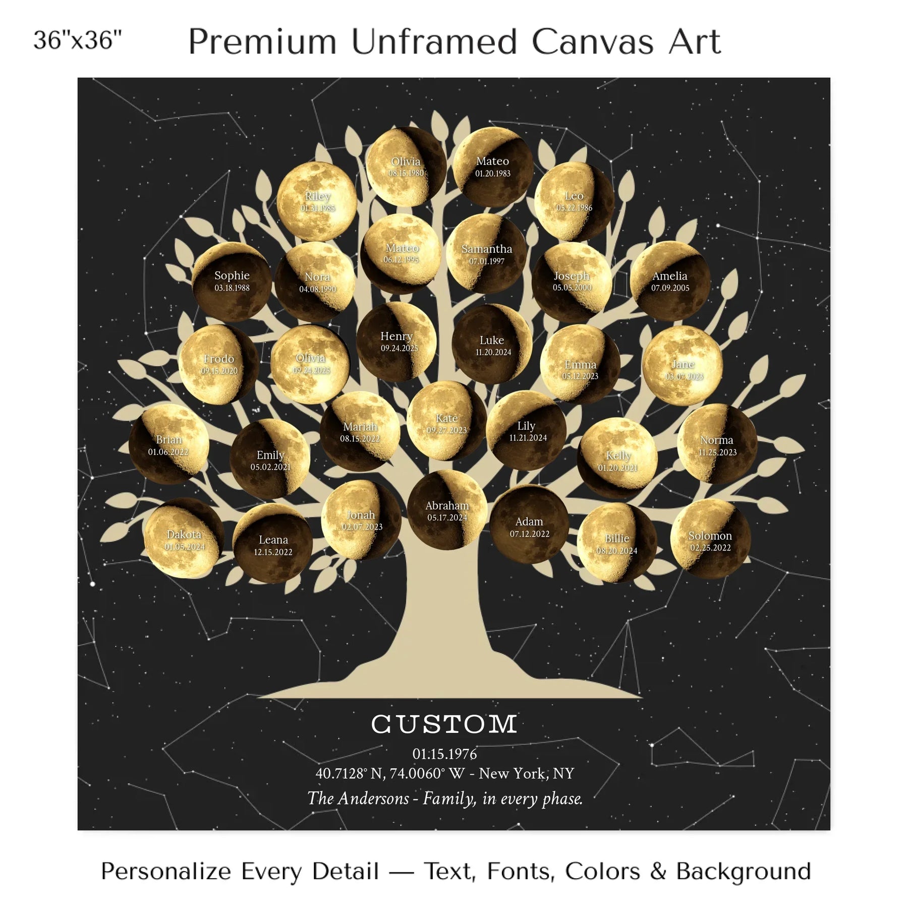 Custom Golden Moon Phase Family Tree Wall Art – A Celestial Tribute to Family
