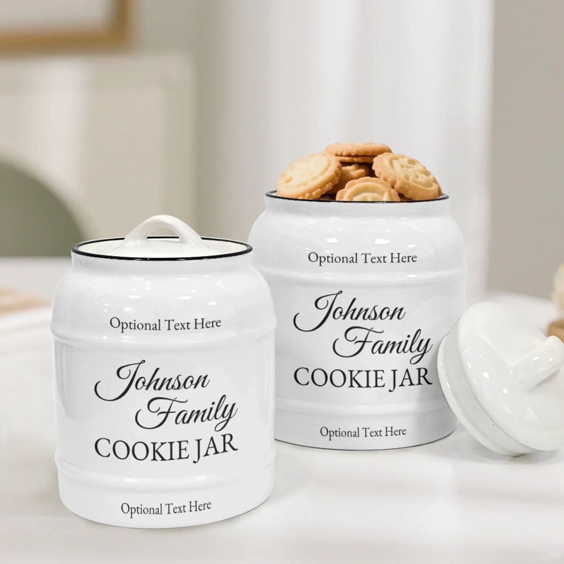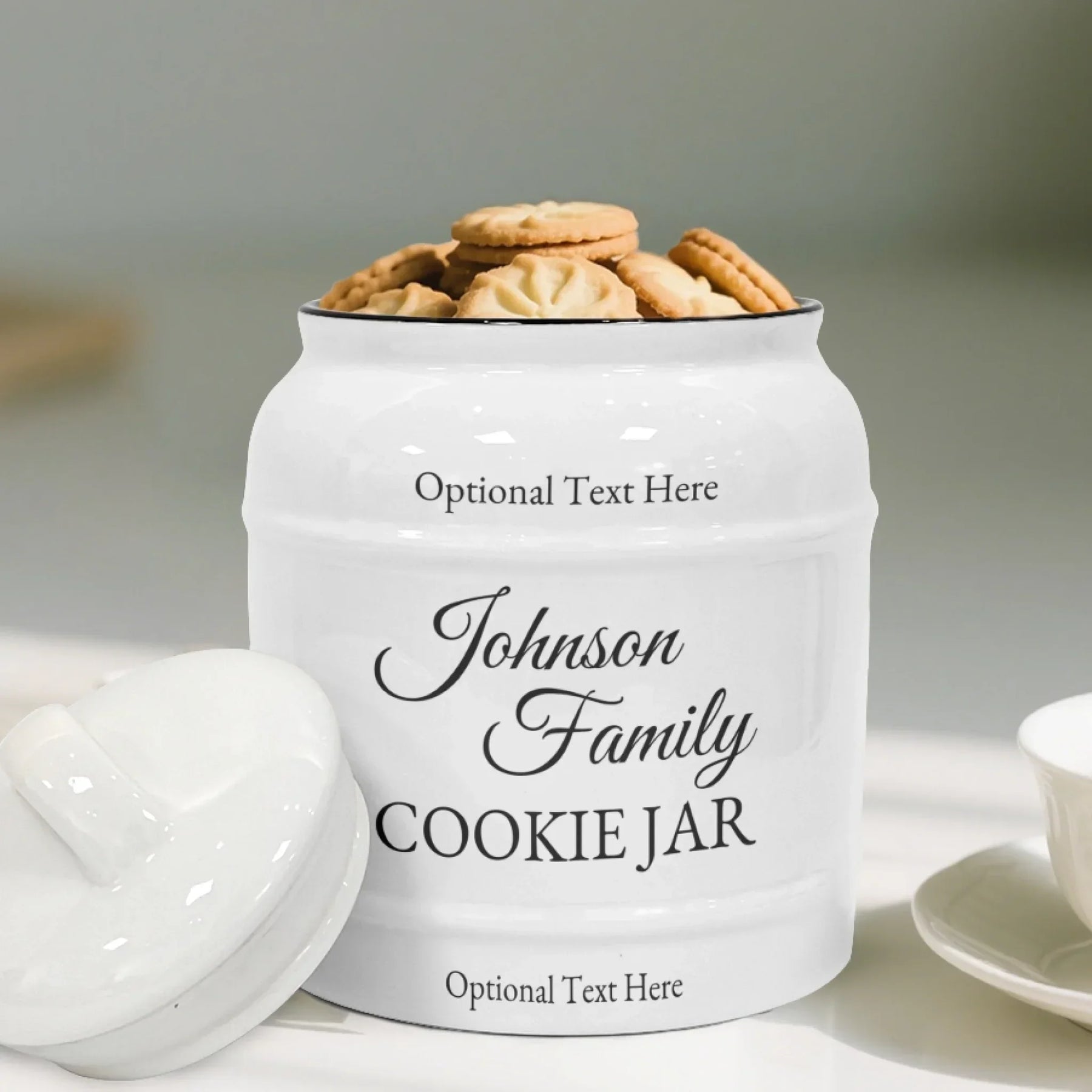 Crafted from premium ceramic, the jar offers a smooth, glossy finish that looks beautiful on open shelves, countertops, and kitchen islands. Its classic rounded structure feels both modern and timeless, ensuring it fits seamlessly into traditional, farmhouse, and contemporary kitchens. The printed family name becomes the focal point of the design, giving each piece a clean, polished, and personalized touch.