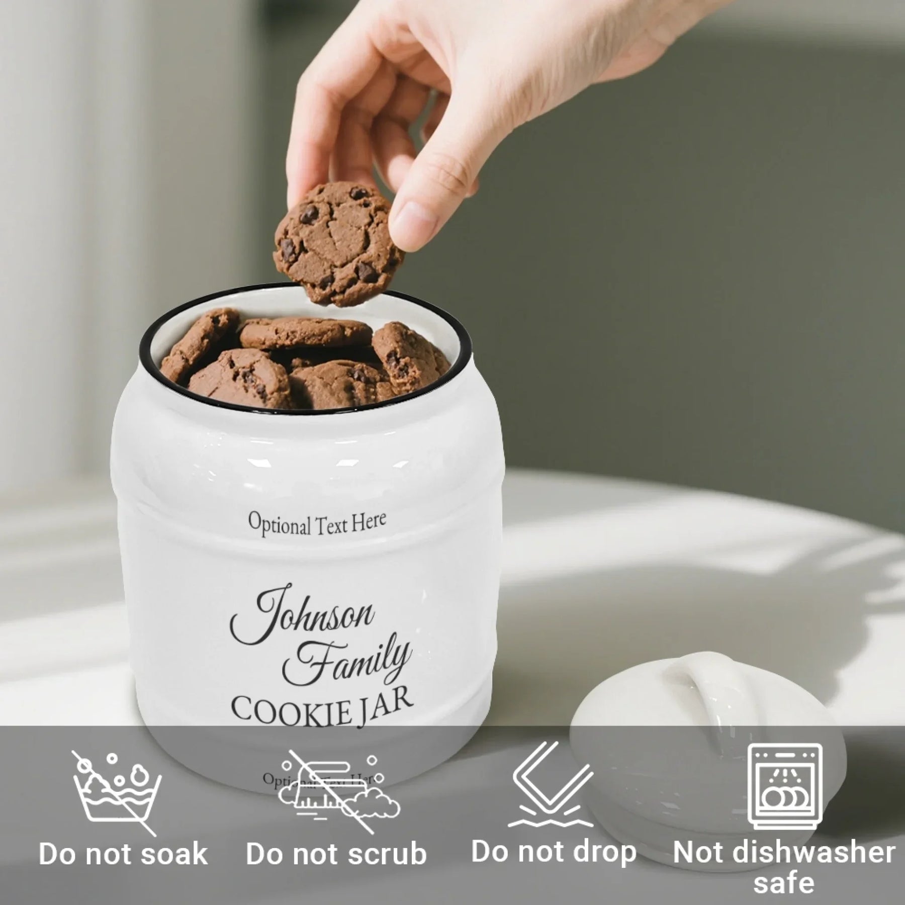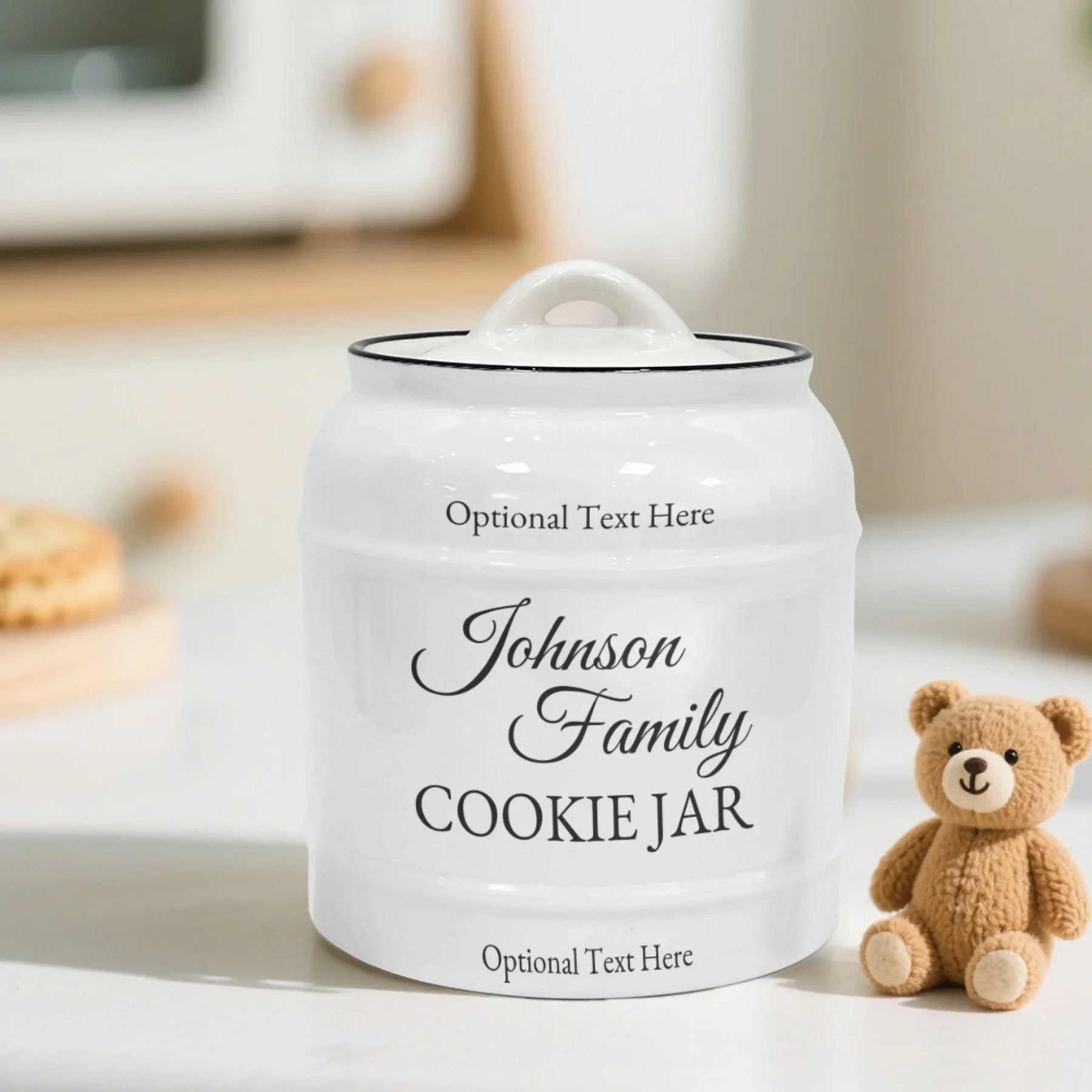 Personalization adds meaningful value to this cookie jar. Customers can enter a family name, such as “The Martinez Family” or “The Blake Household,” in an elegant script font. The optional title area allows additions like “Our Kitchen,” “Baked With Love,” or “Welcome Home.” The optional footer can hold dates, family mottos, or special messages. With customizable fonts and colors, each piece becomes a unique family treasure or unforgettable gift.